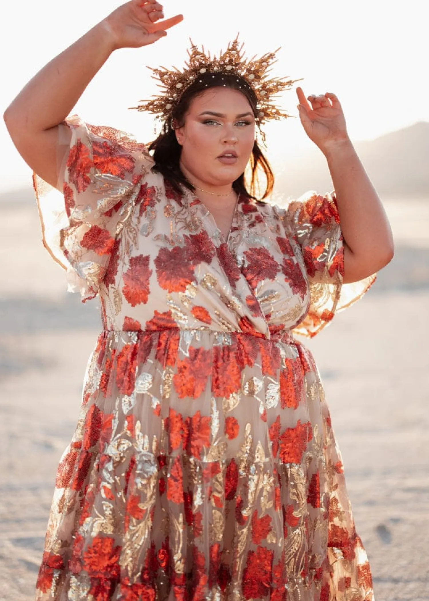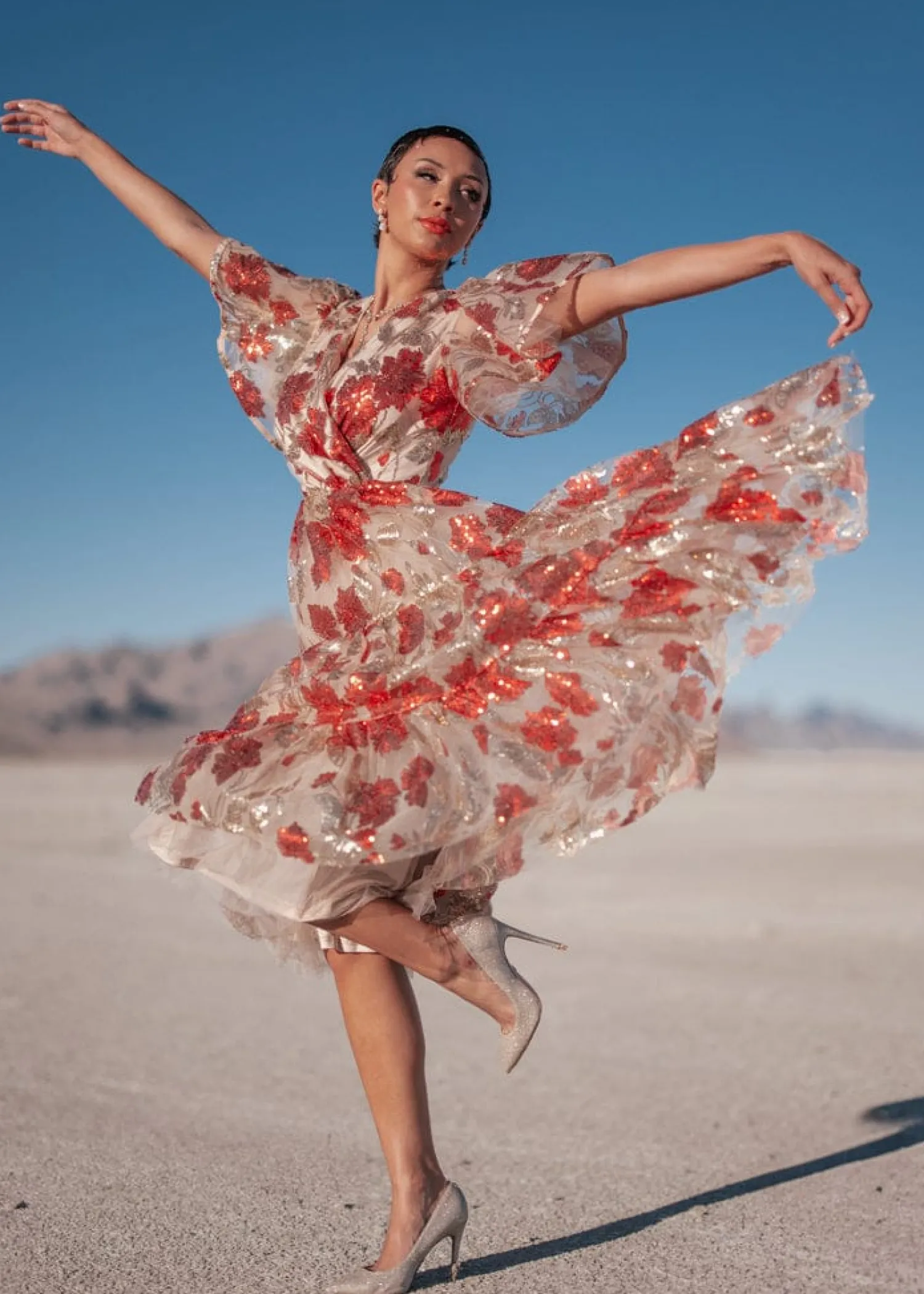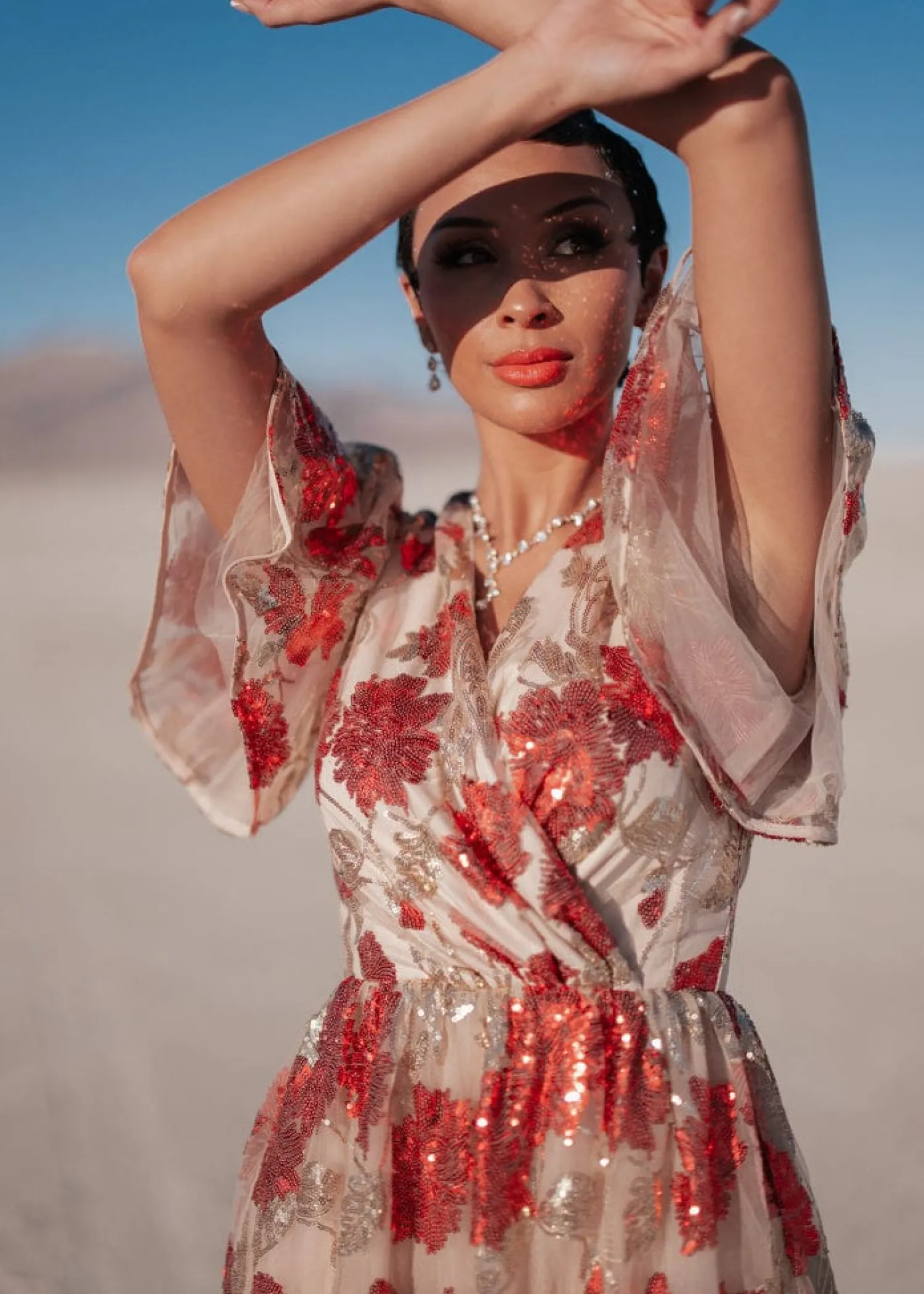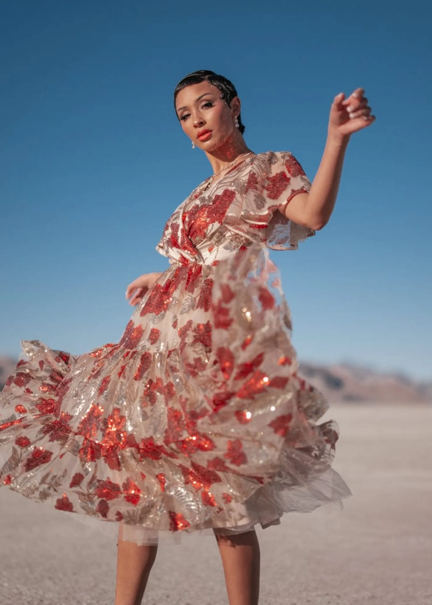Step into a world of glamour with the Anna Dress, a standout piece from our Celestial Collection. Adorned with vibrant red and gold sequins on a soft nude base, this dress captures the magic of celebration. Its flowy silhouette and elastic puff sleeves offer a timeless elegance, perfect for New Year's Eve and all the holiday festivities. Shine bright and make every moment unforgettable in this stunning design.