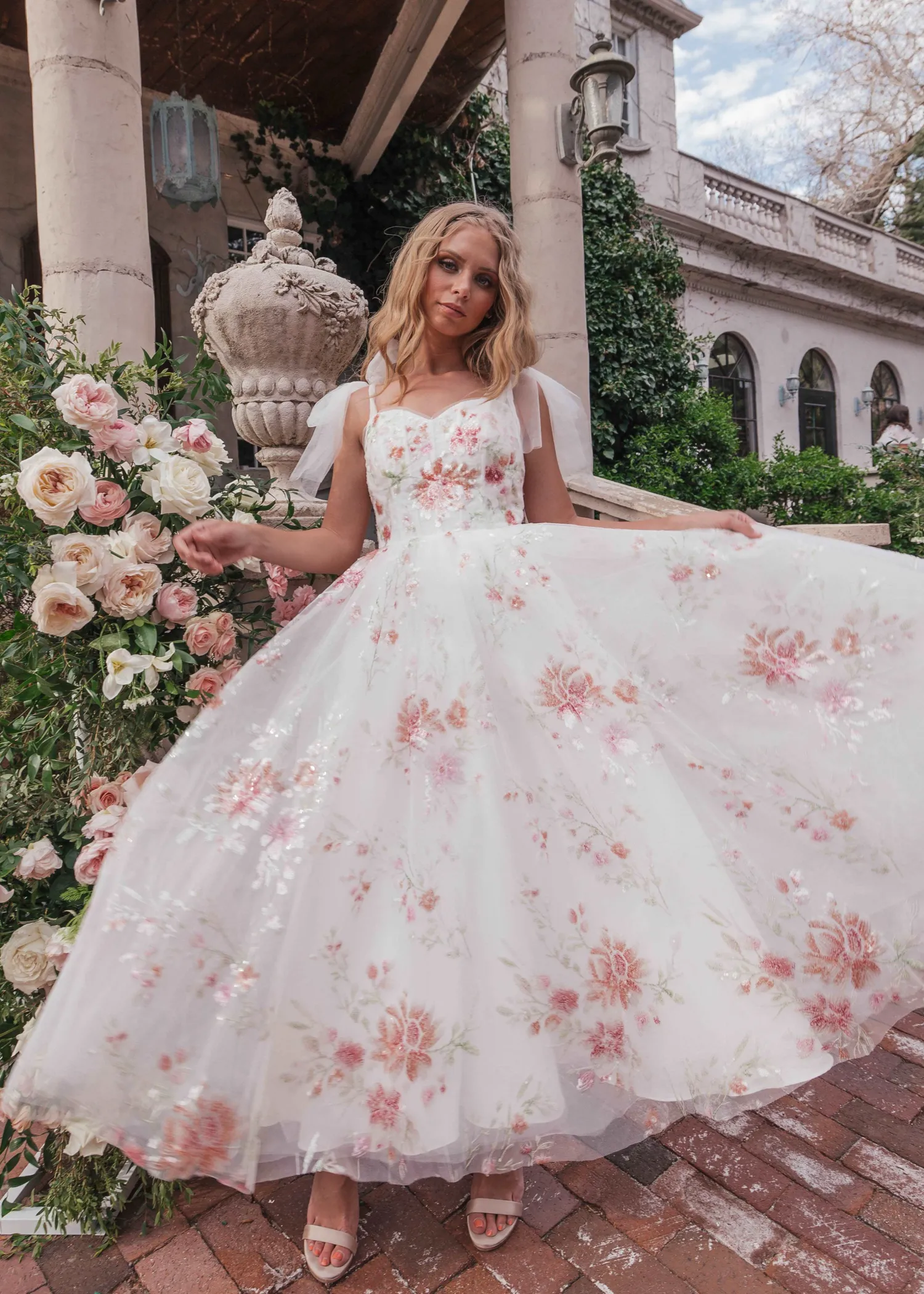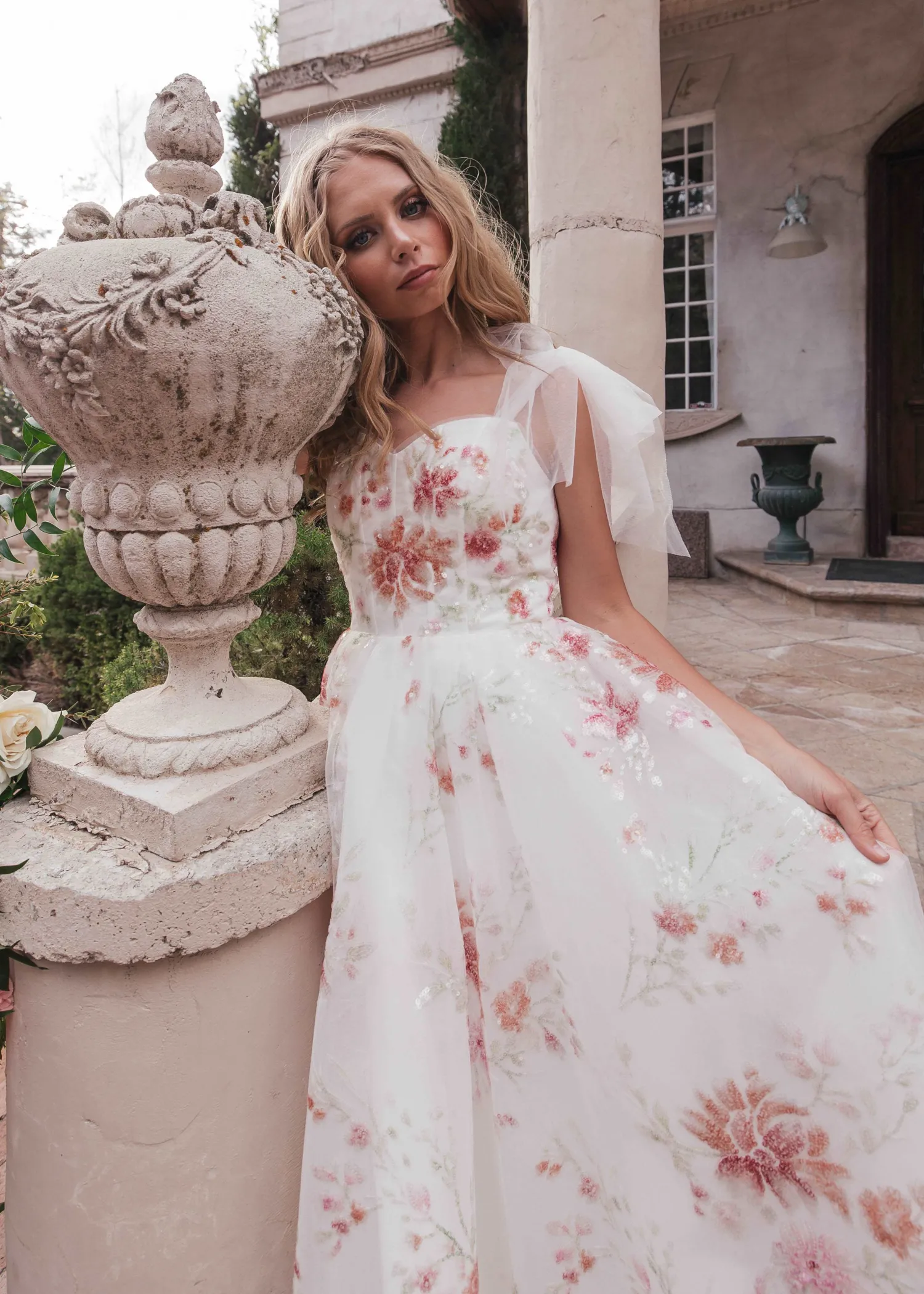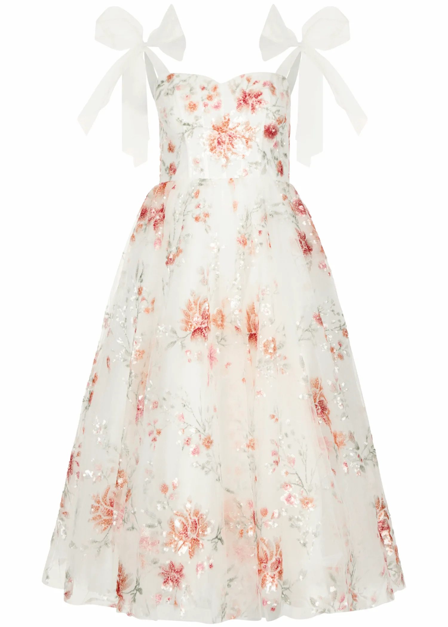 Embrace the dazzling beauty of this sequined floral midi, which exudes a bold allure. Blended hues of muted red and orange evoke a theme of gentle passion. With adjustable tie sleeves and a flattering V neckline, it's a flattering ensemble for any occasion, radiating elegance and charm. Choose this dress for any event, and you're sure to make an unforgettable impression.