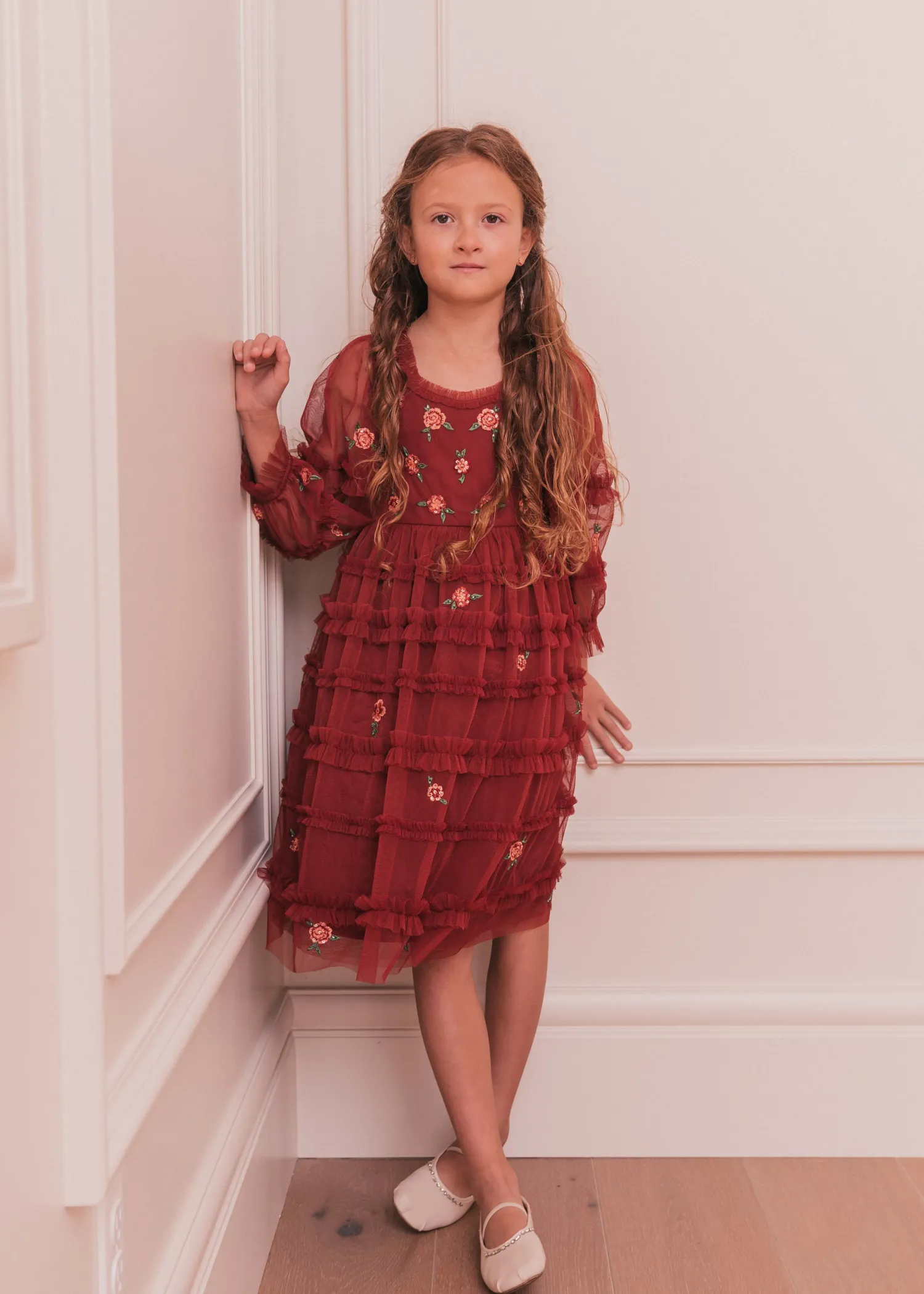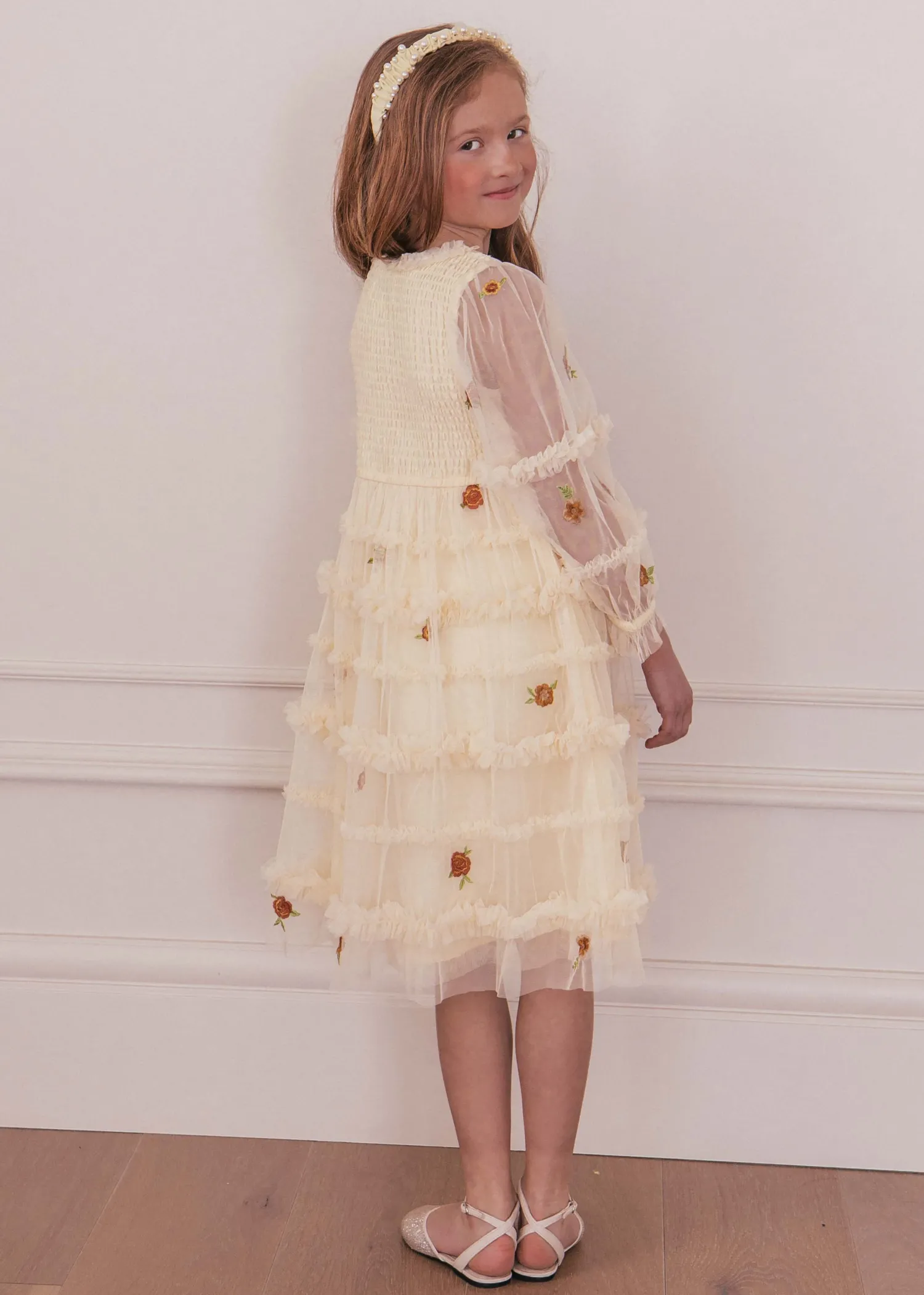 This darling girl's dress can be worn to match or worn on its own. Features ruffles along the skirt and sleeves, orange embroidered flower accents, a smocked back, and long sheer sleeves to give your little one that comfortable fit.