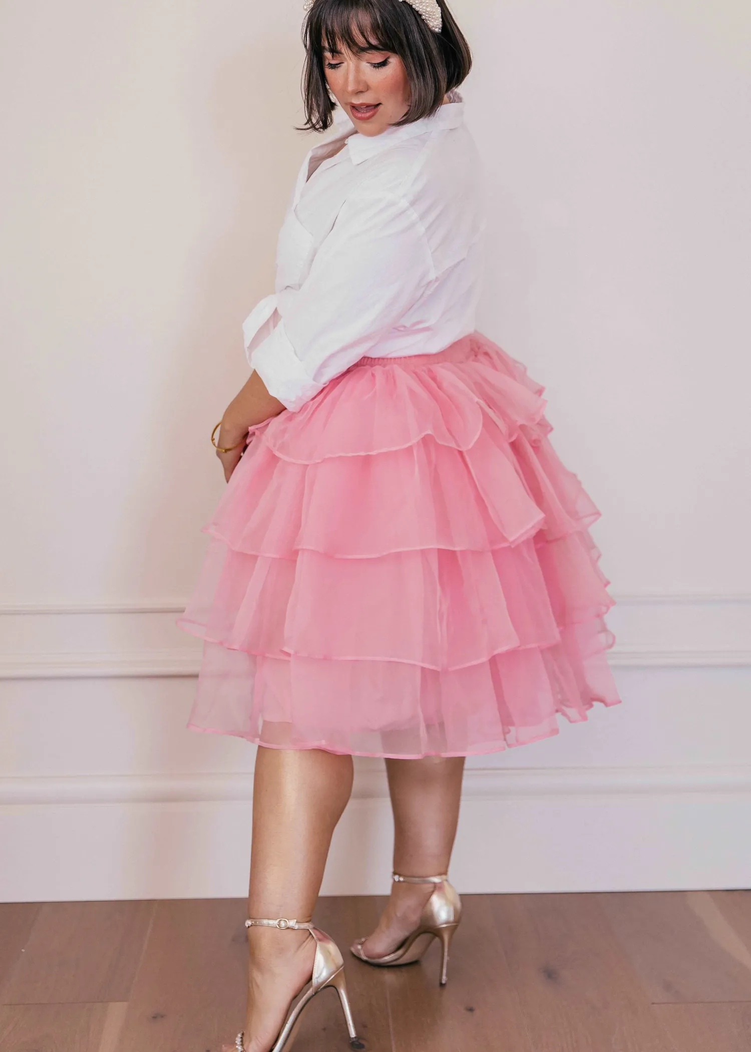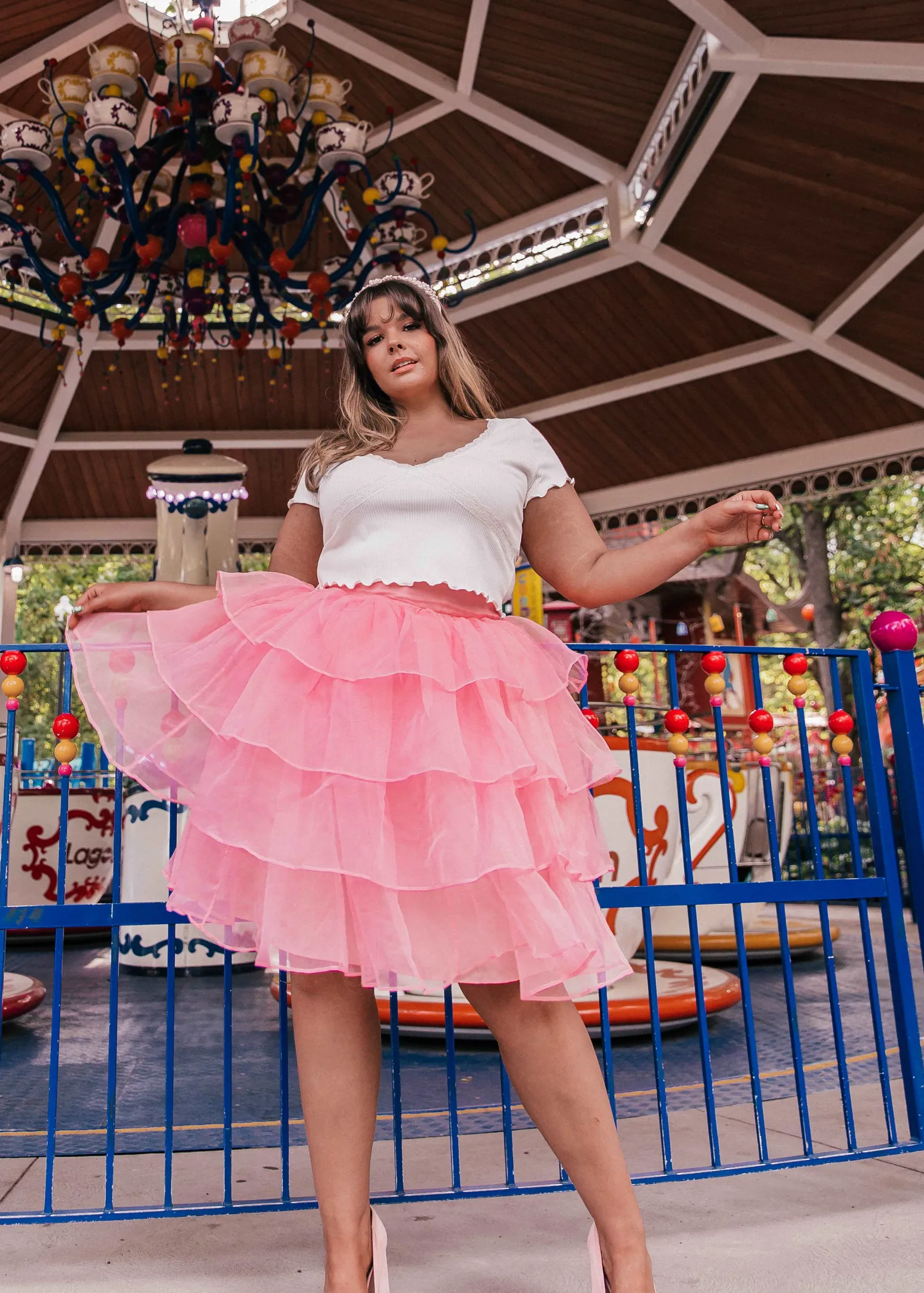 When you're headed to the fair, or a carnival or just out for a night on the town, this pink-tiered skirt will be your go-to! With voluminous tiers, elastic waistline in back and midi length, this skirt was made for fun! Perfectly paired with your favorite top.