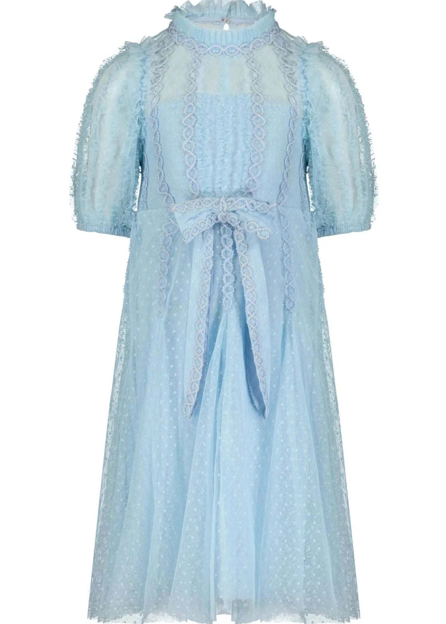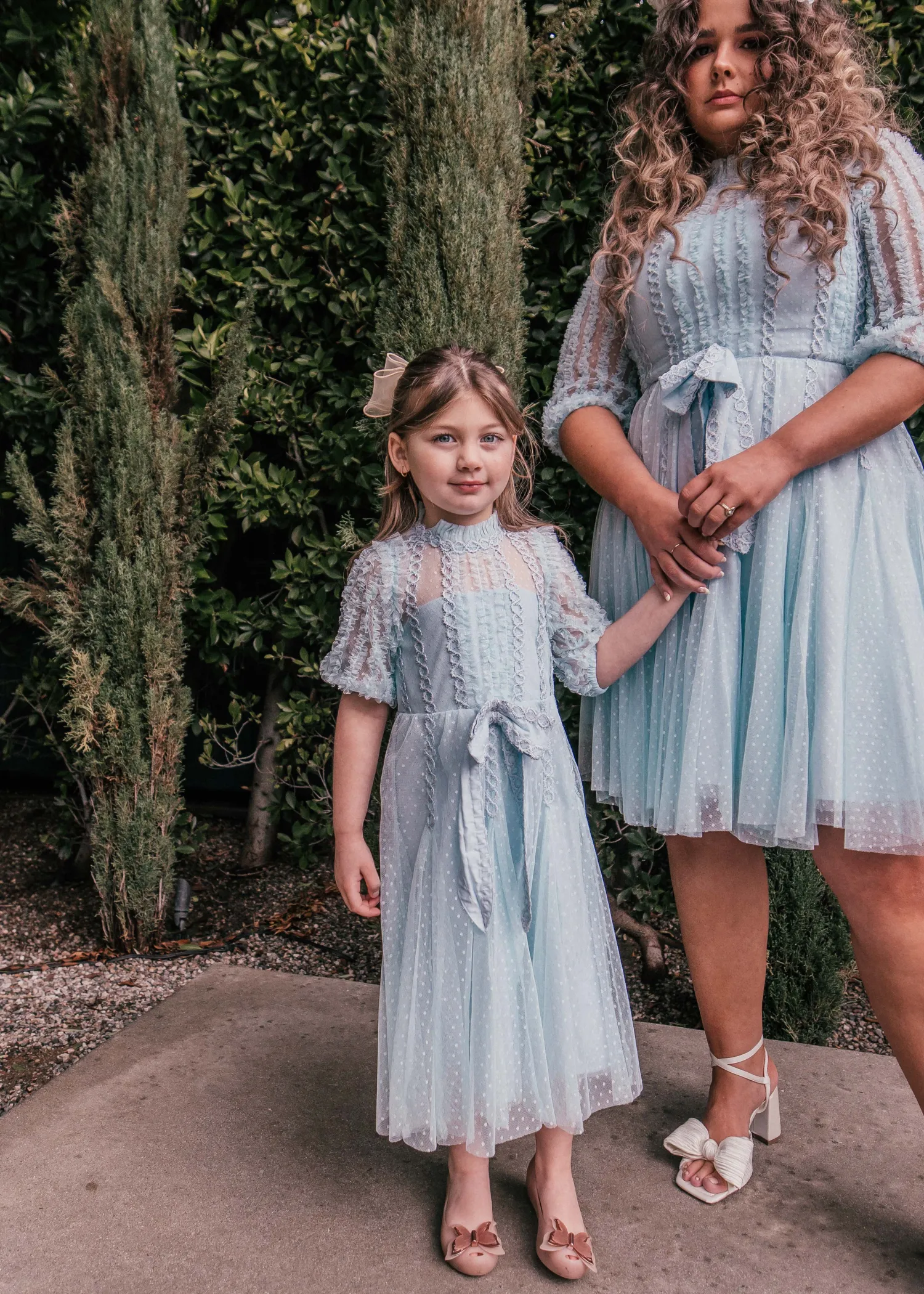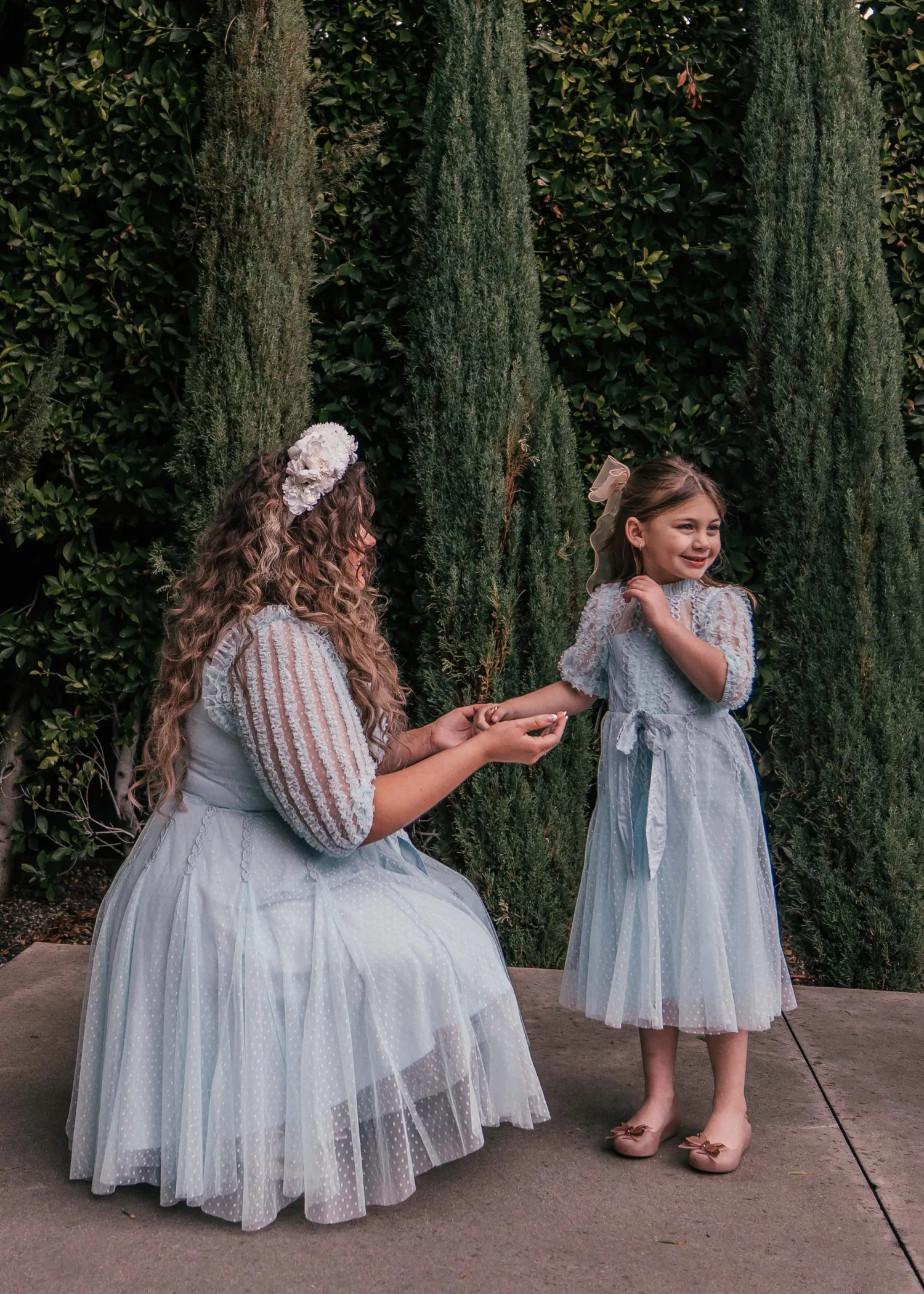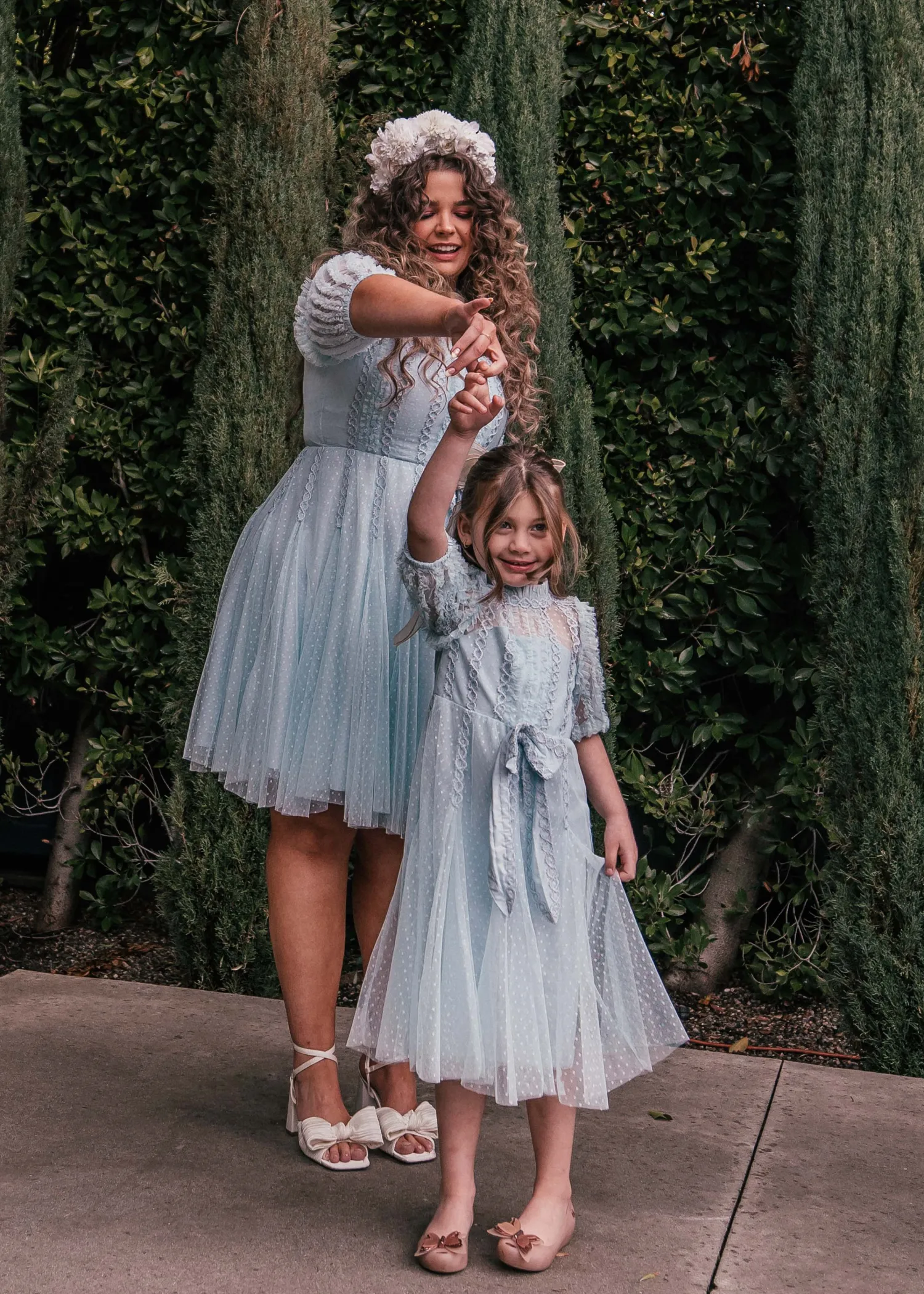 This darling girl's dress can be worn to match or worn on its own. Features a swiss dot print, ruffle embellishments along the bodice, sleeves, and waistline, and a front bow to match the Cecilia Dress.