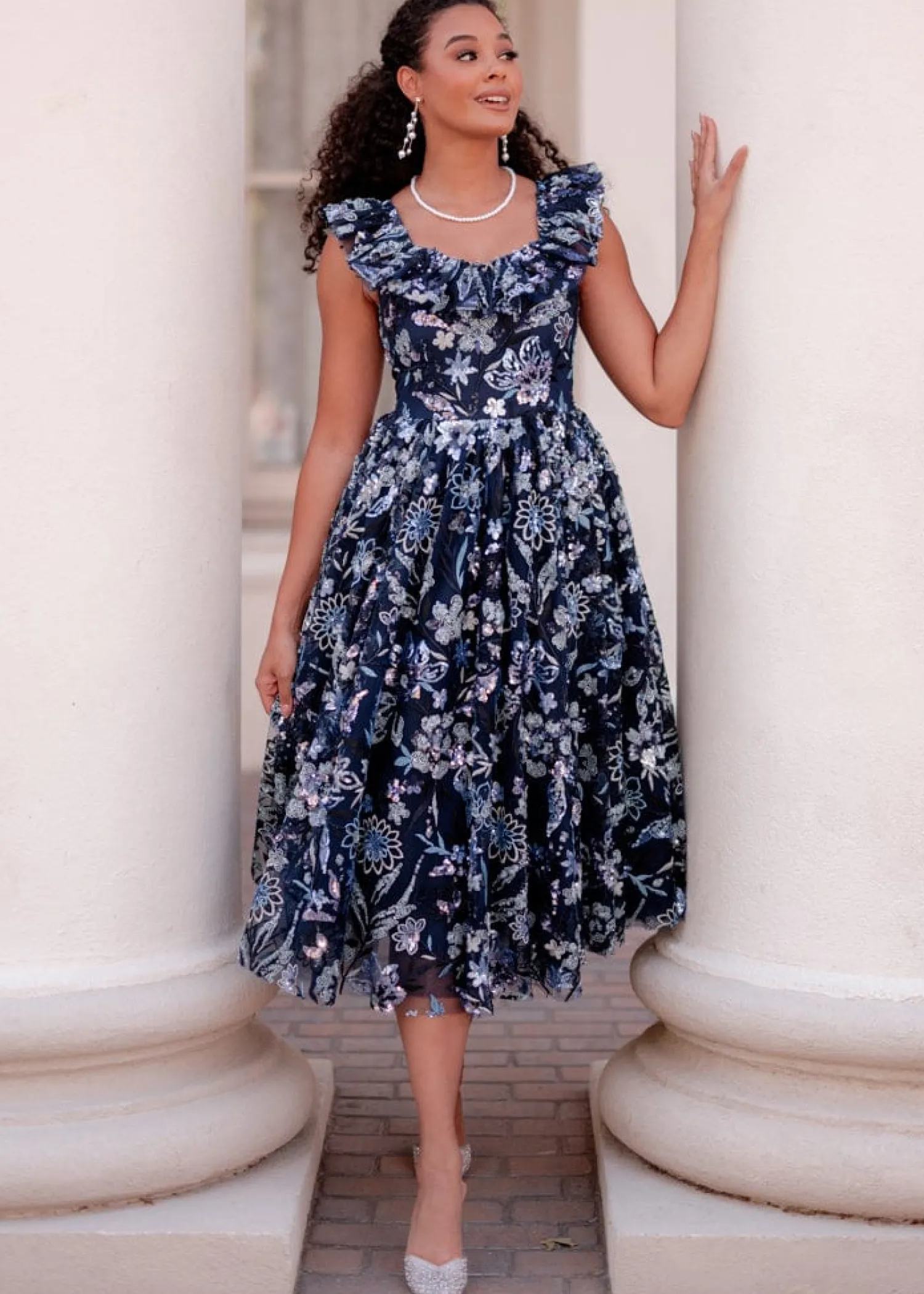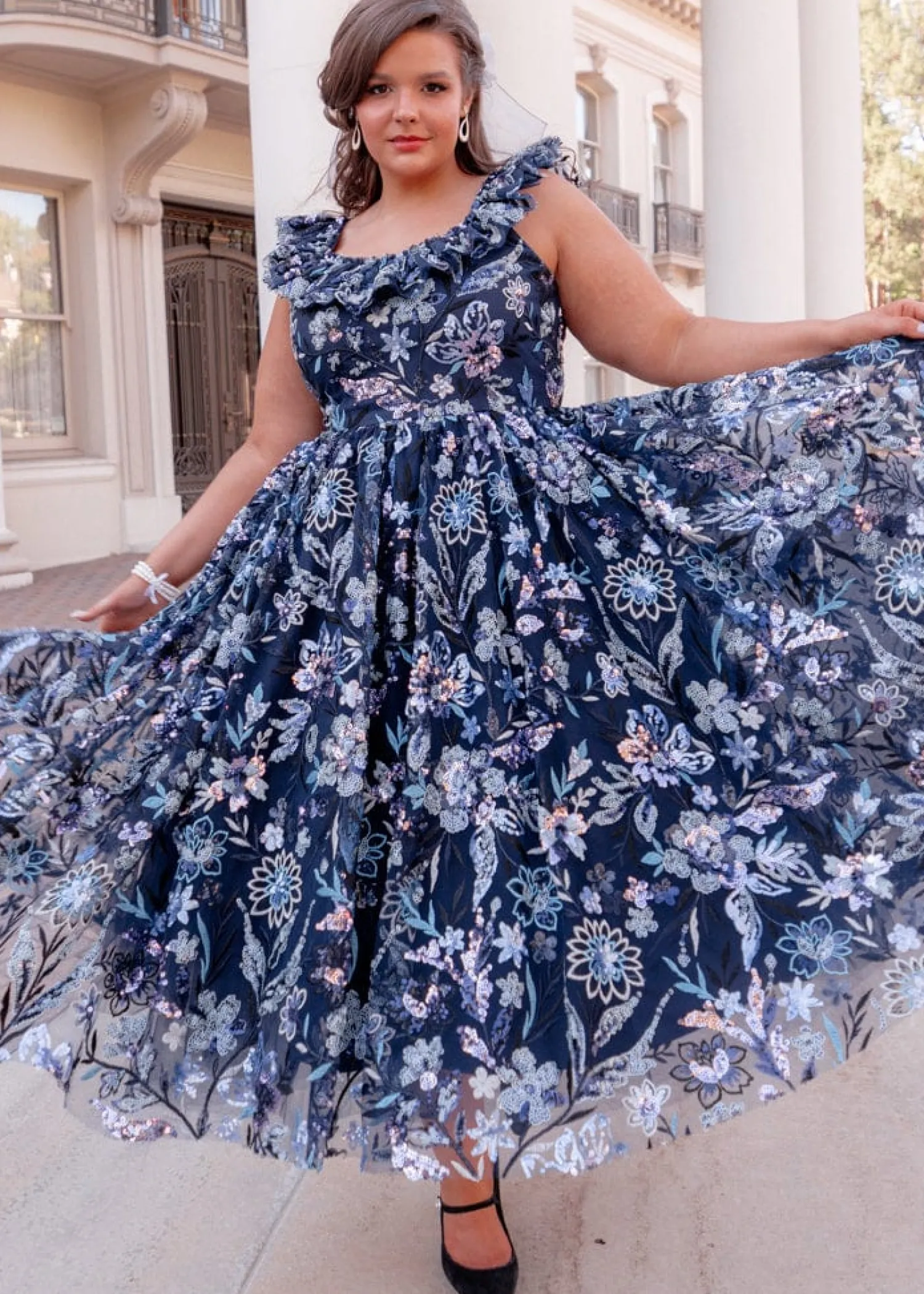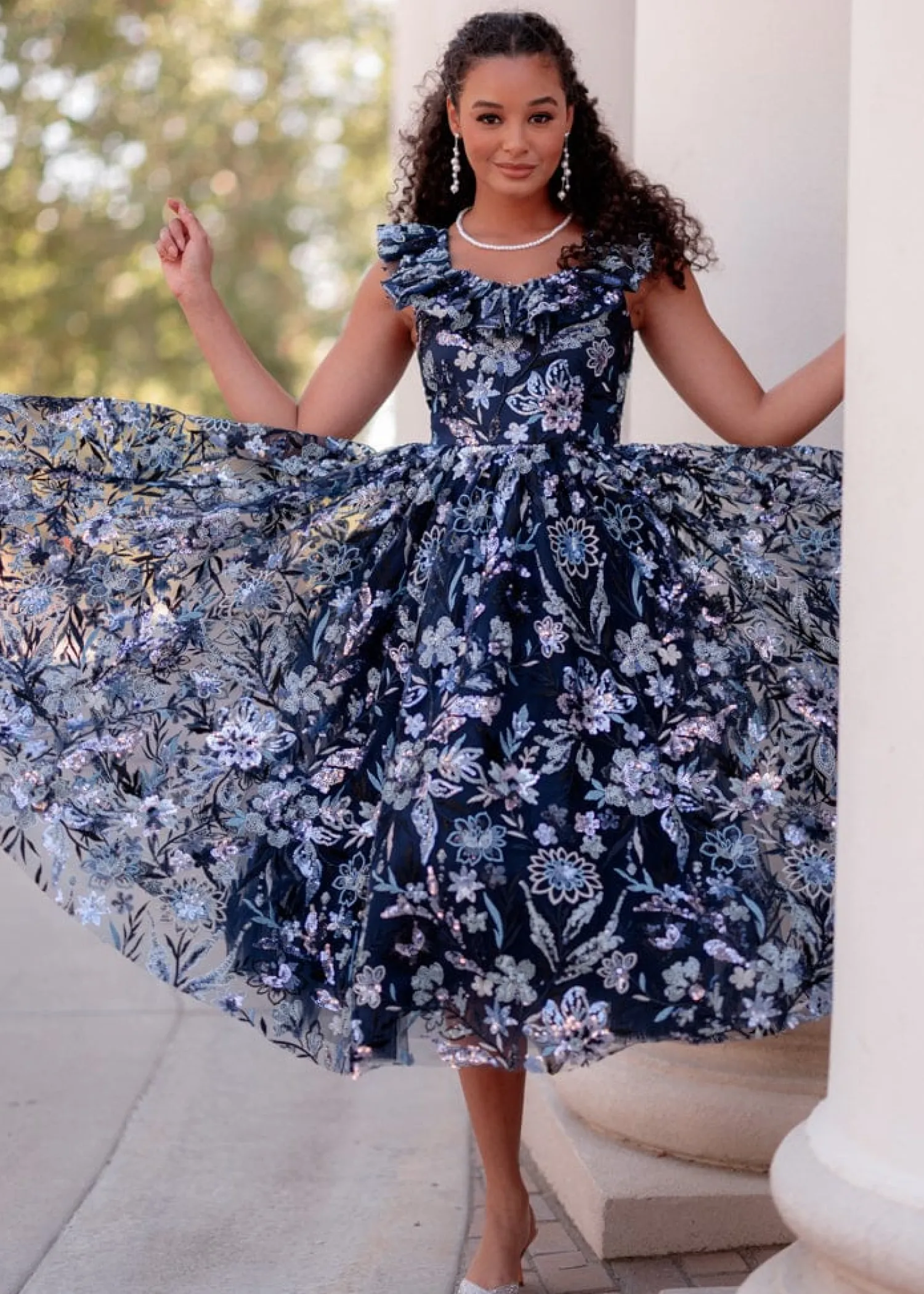 Dazzle this holiday season in our Chrissy Dress. This stunning blue dress is adorned with sparkling sequins that shimmer with every step, perfect for capturing the magic of the season. The romantic ruffle sweetheart neckline adds a touch of softness and elegance, while the fitted bodice enhances your silhouette. Whether you're attending a glamorous Christmas party, a festive family gathering, or ringing in the New Year, the Chrissy Dress promises to make you feel like the star of the show.