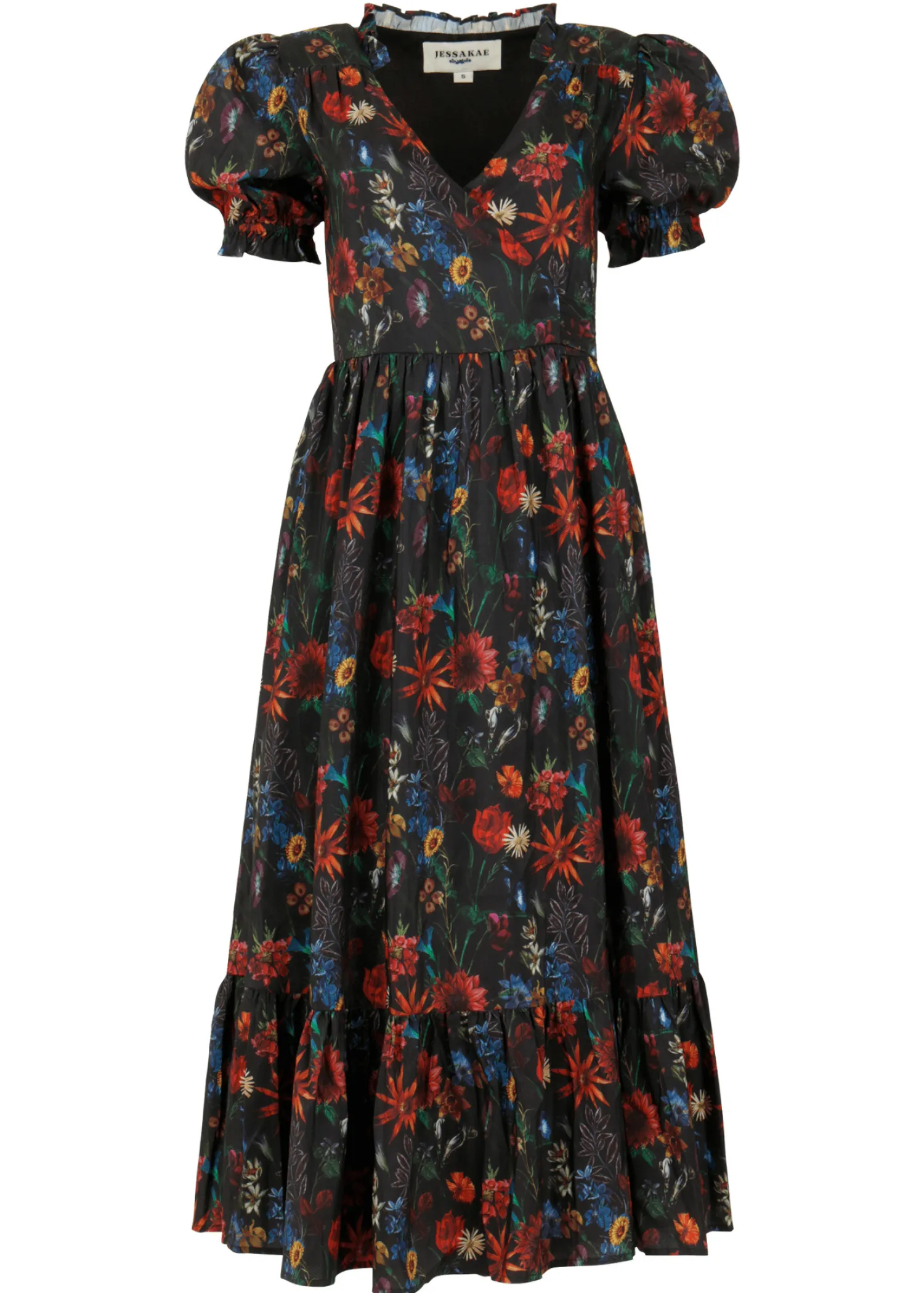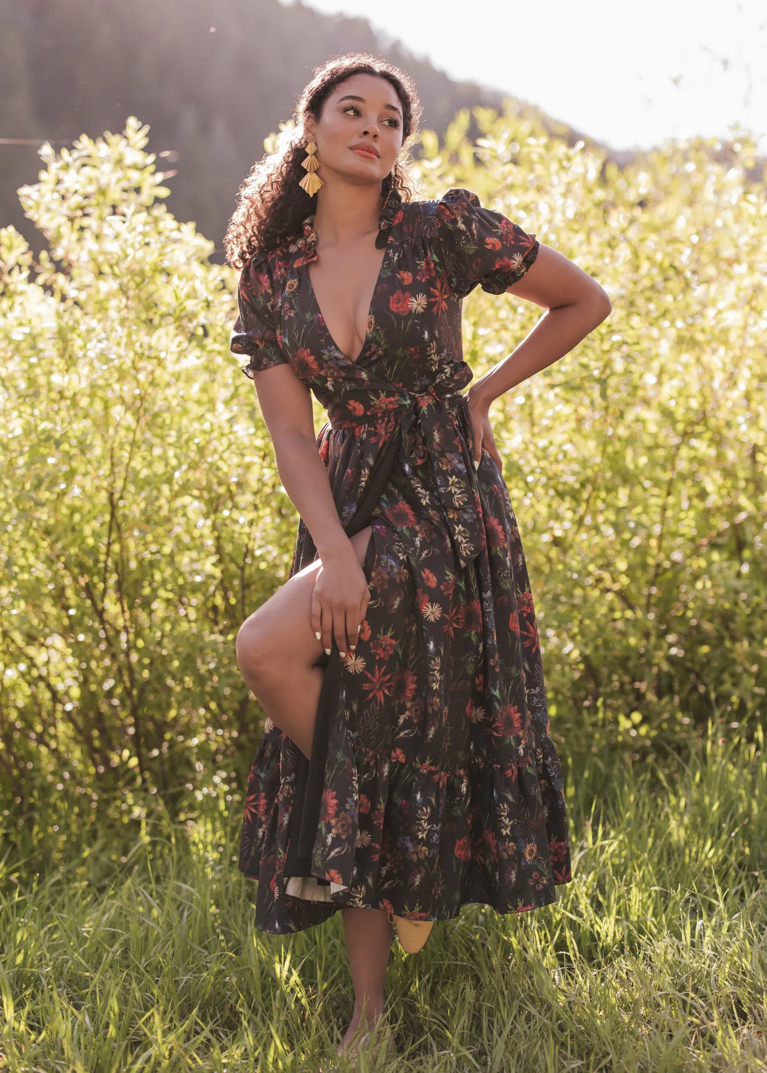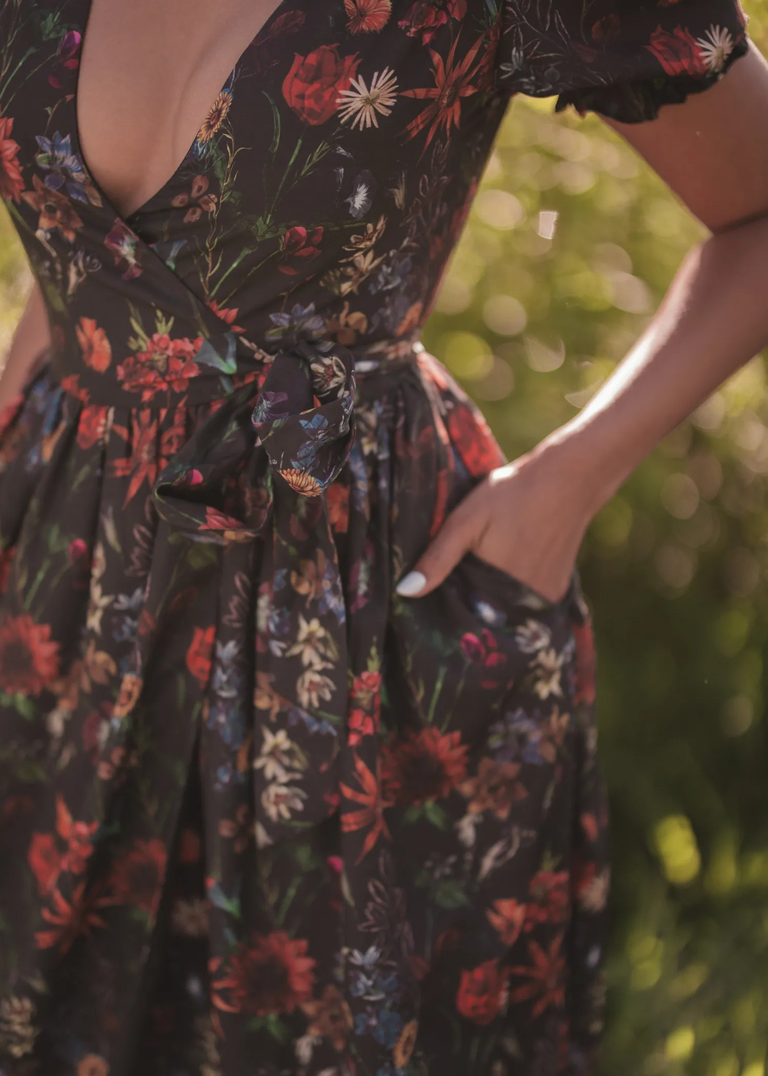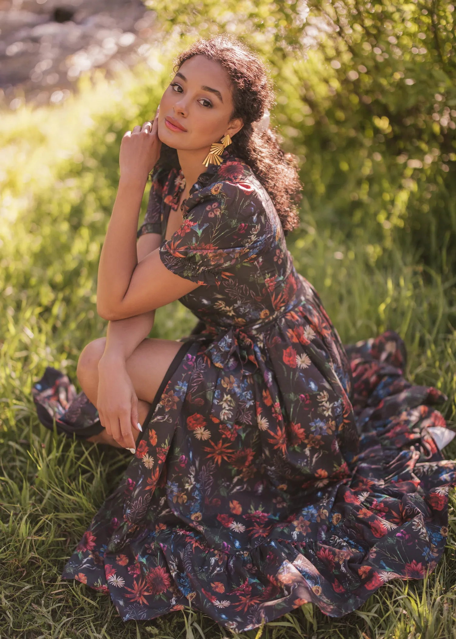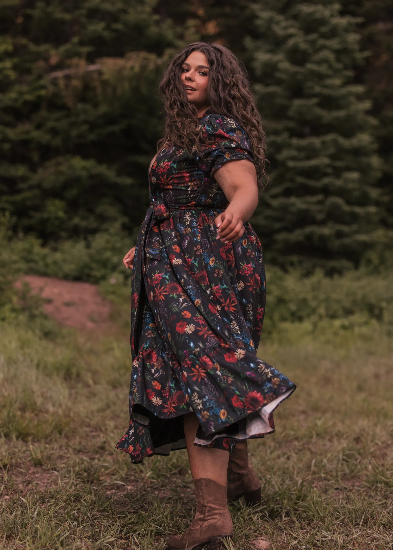 This captivating dress features a flattering plunging neckline and short puff sleeves, exuding both elegance and allure. The rich floral print against a darkened background beautifully reflects the enchanting colors of an autumn forest. Embrace your inner enchantress with the stunning Elara Dress.