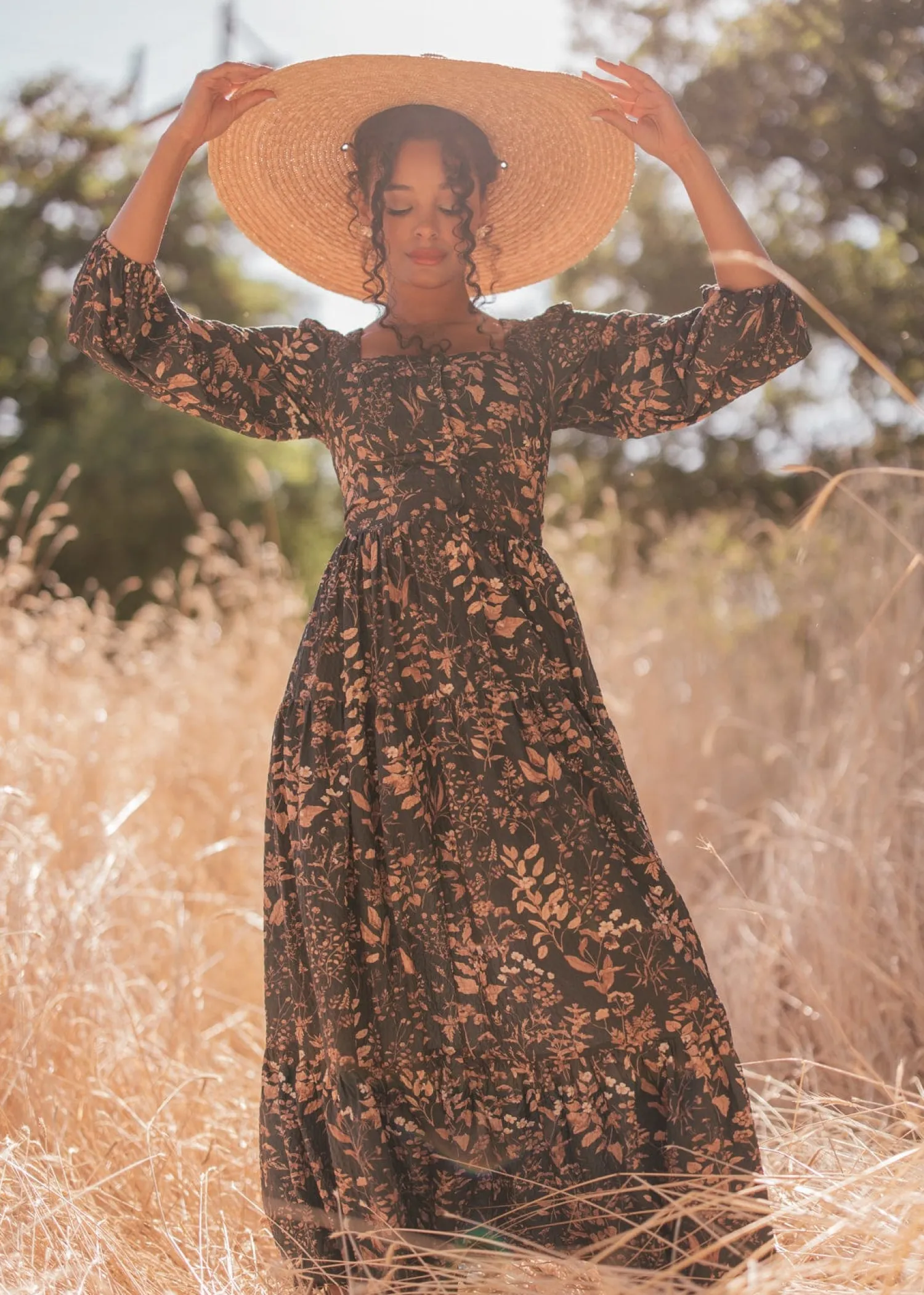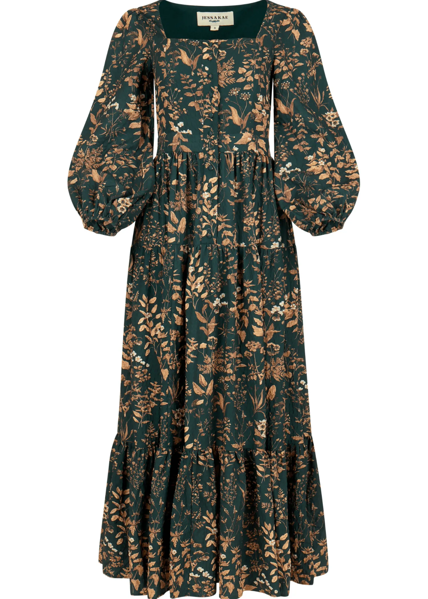 True to its name, the Fern dress features a golden fern print against a lush, dark green background. This nature-inspired gown features a flattering square neckline and voluminous puff sleeves that add a touch of vintage elegance to this striking design perfect for any fall occasion!