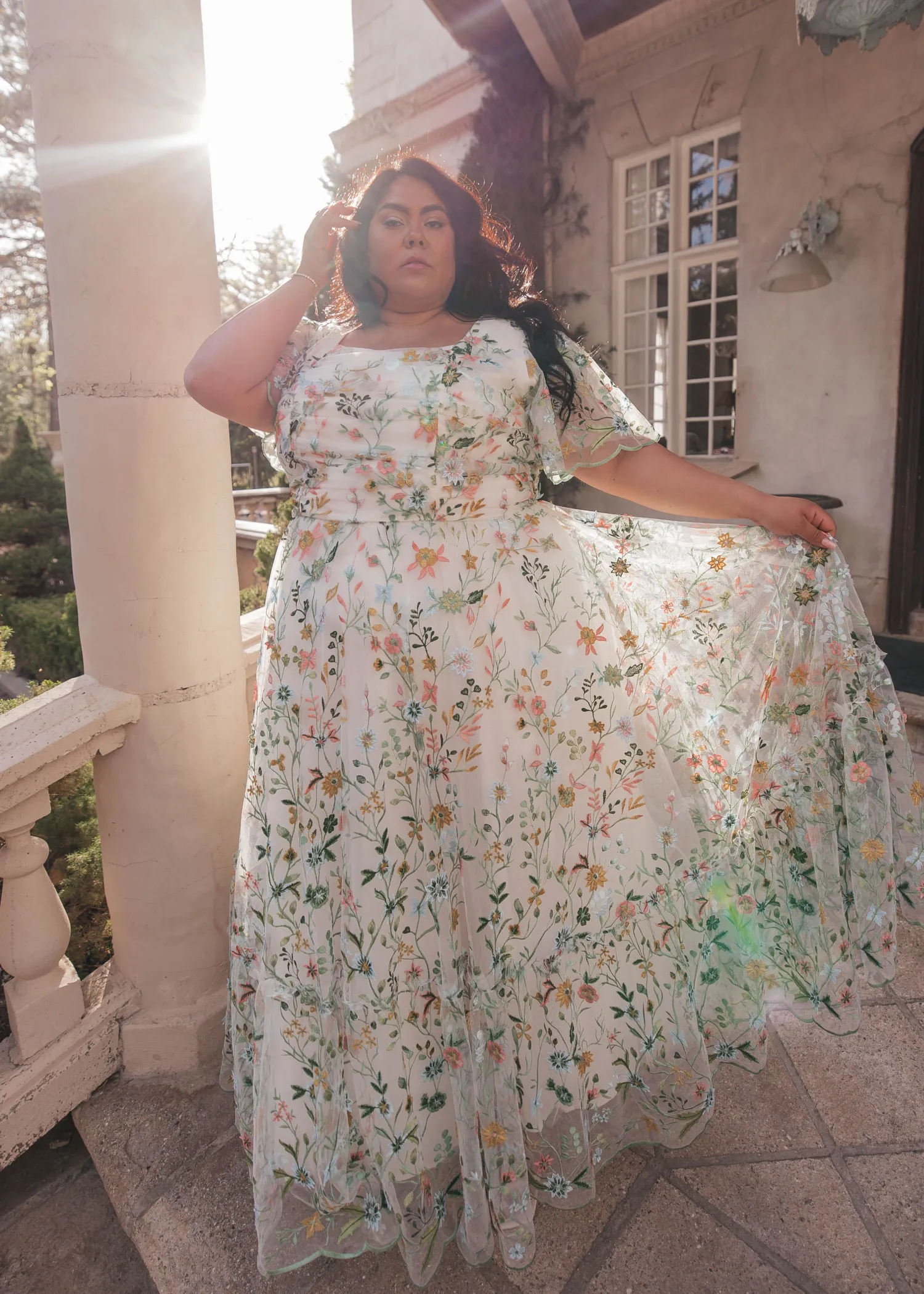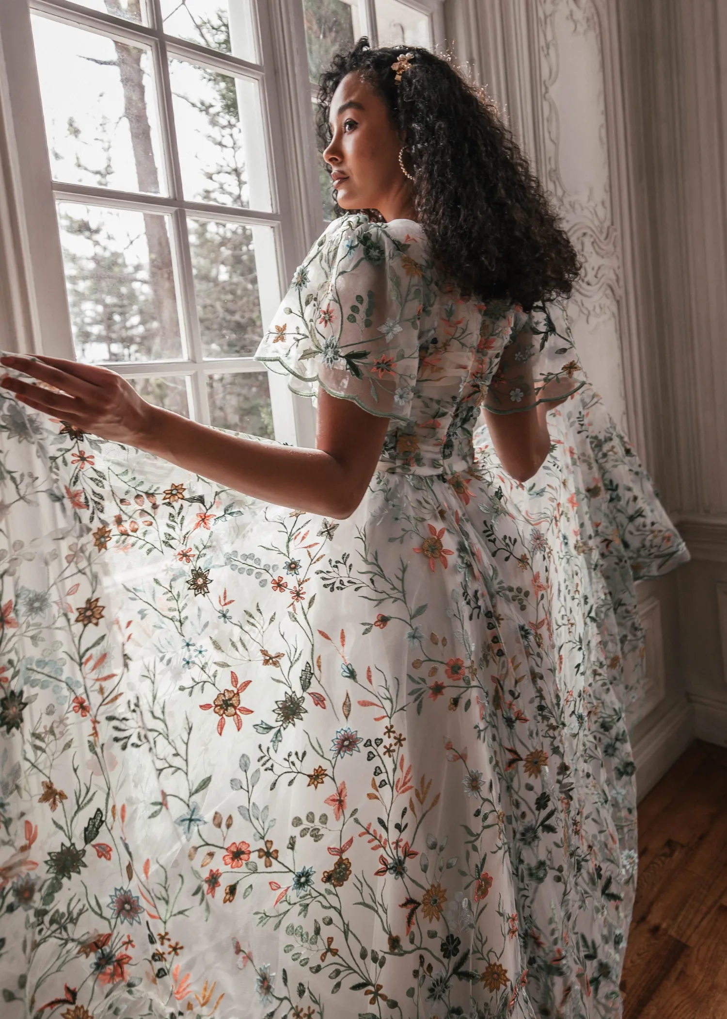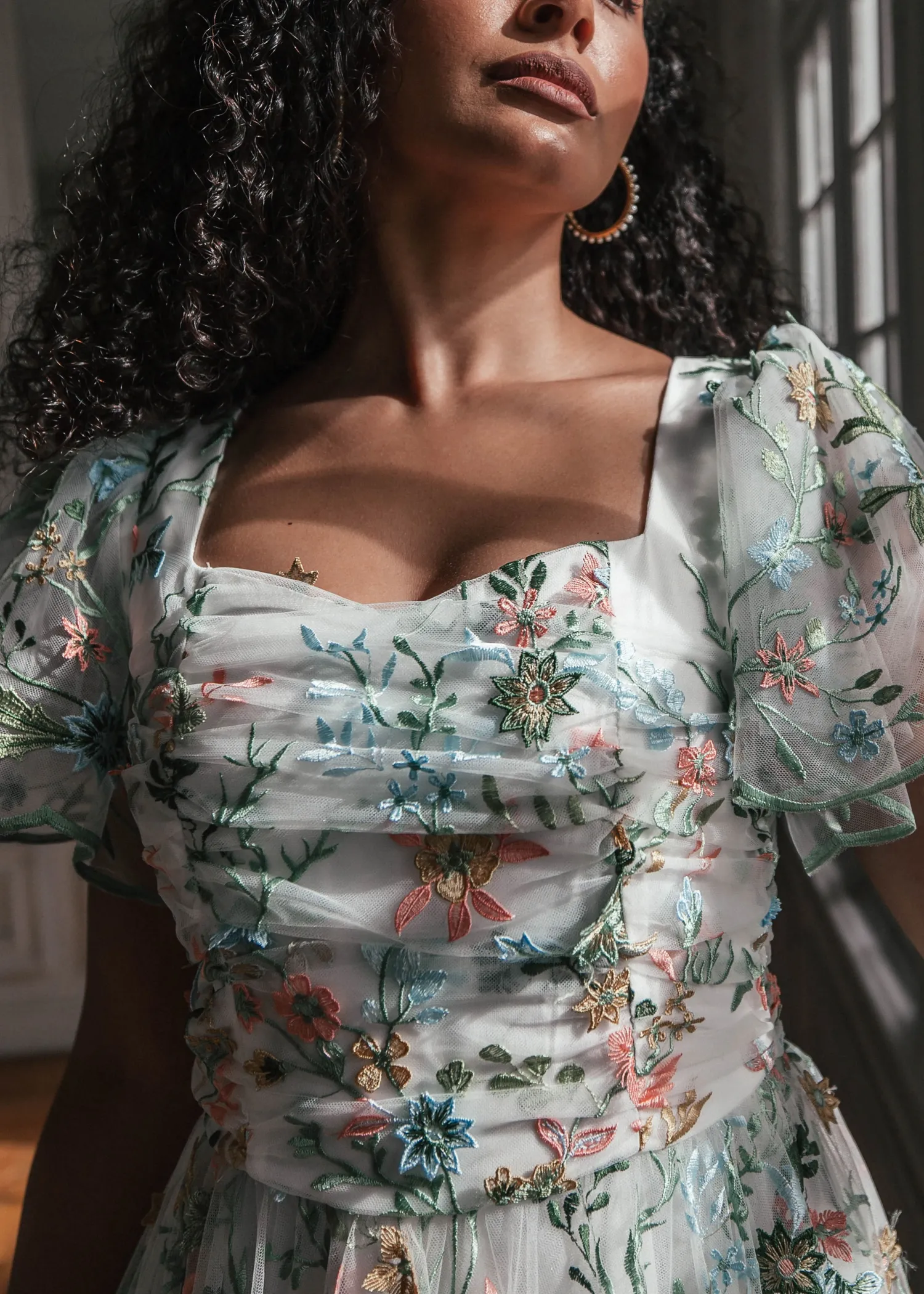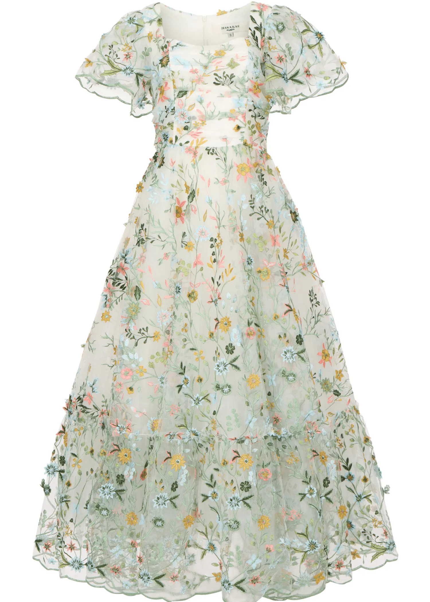 Love is in full bloom. Adorned with lush embroidered florals, this exquisite gown exudes the elegance of spring. A ruched, accentuated bodice paired with flutter sleeves imbues a sense of gentle beauty. Scalloped edges at the hem and lined along the sleeves remind the wearer that love is ever in the details. Take the romance of the meadow with you everywhere you go, and watch your happily ever after blossom.