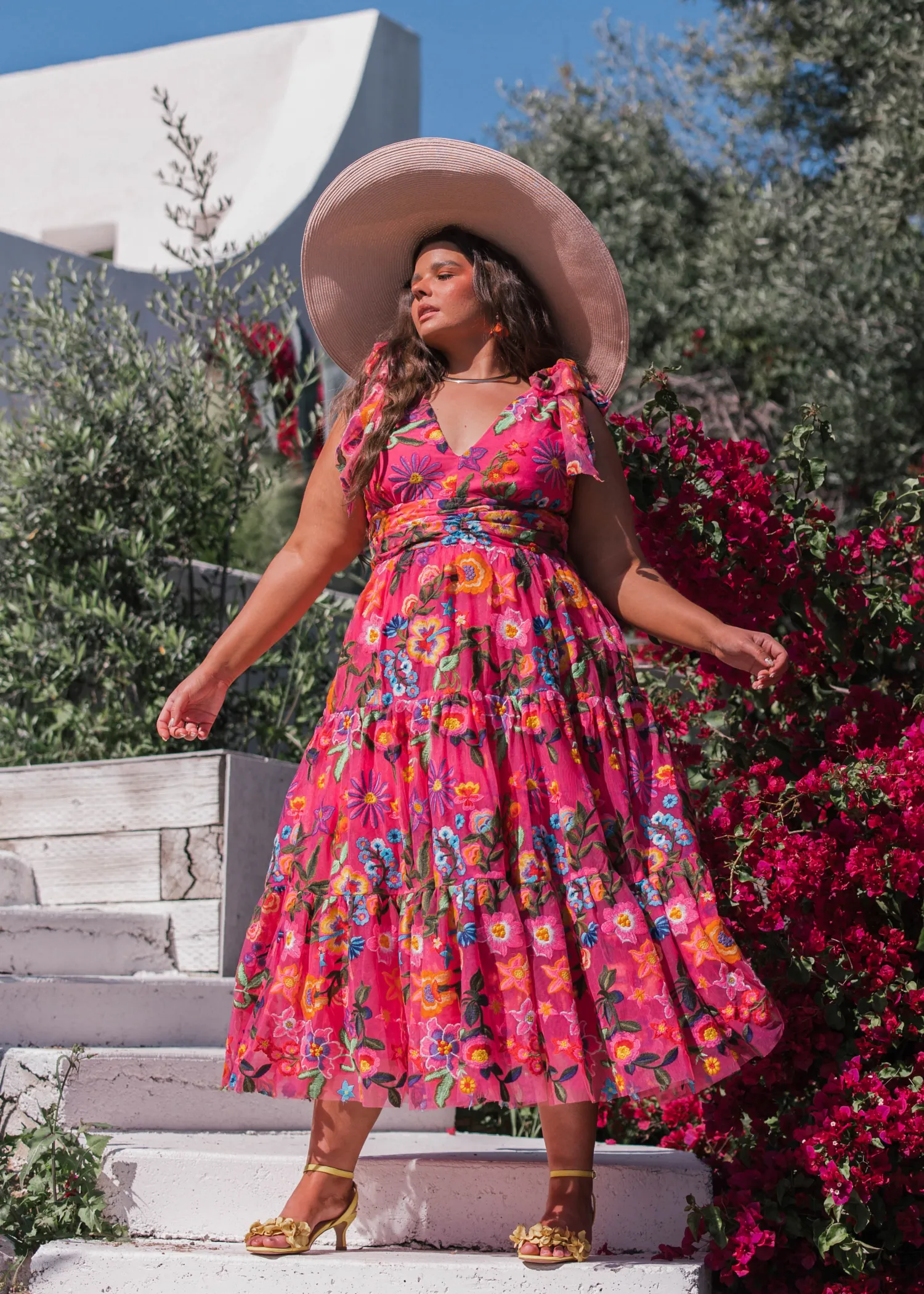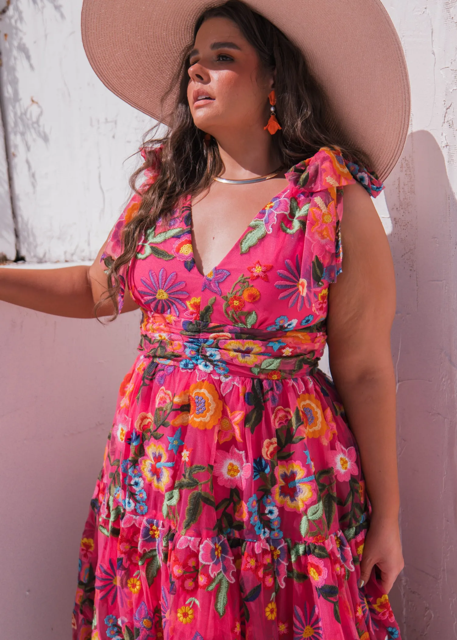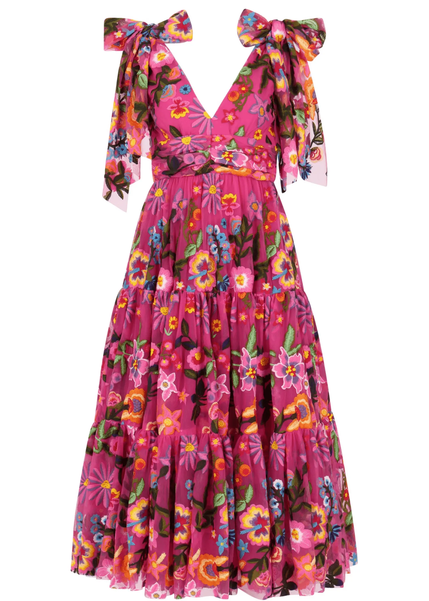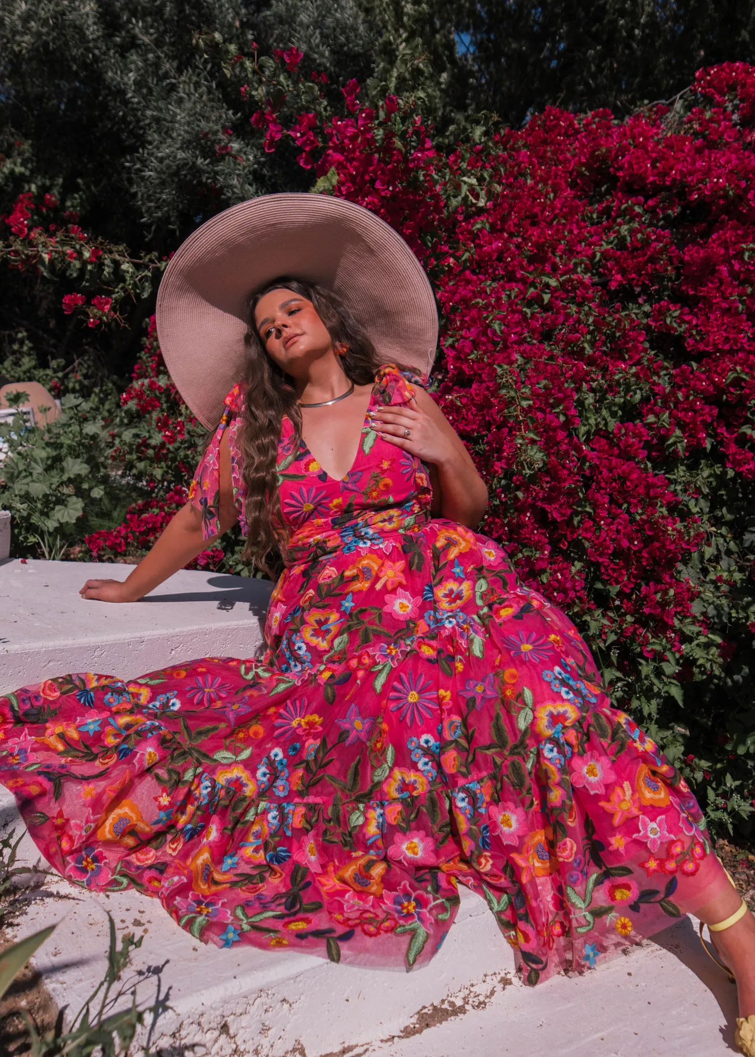 Introducing our enchanting "Hibiscus" dress, the crown jewel of our Paradise Collection. This v-neck wonder boasts a passionate fuchsia tone, adorned with a burst of mystical tropical floral embroideries in a vibrant rainbow palette. With its tie sleeves adding a touch of romance, this dress evokes the essence of colorful joy, making it a magical choice for any occasion. Let the allure of hibiscus blooms transport you to a world of tropical splendor wherever you go.