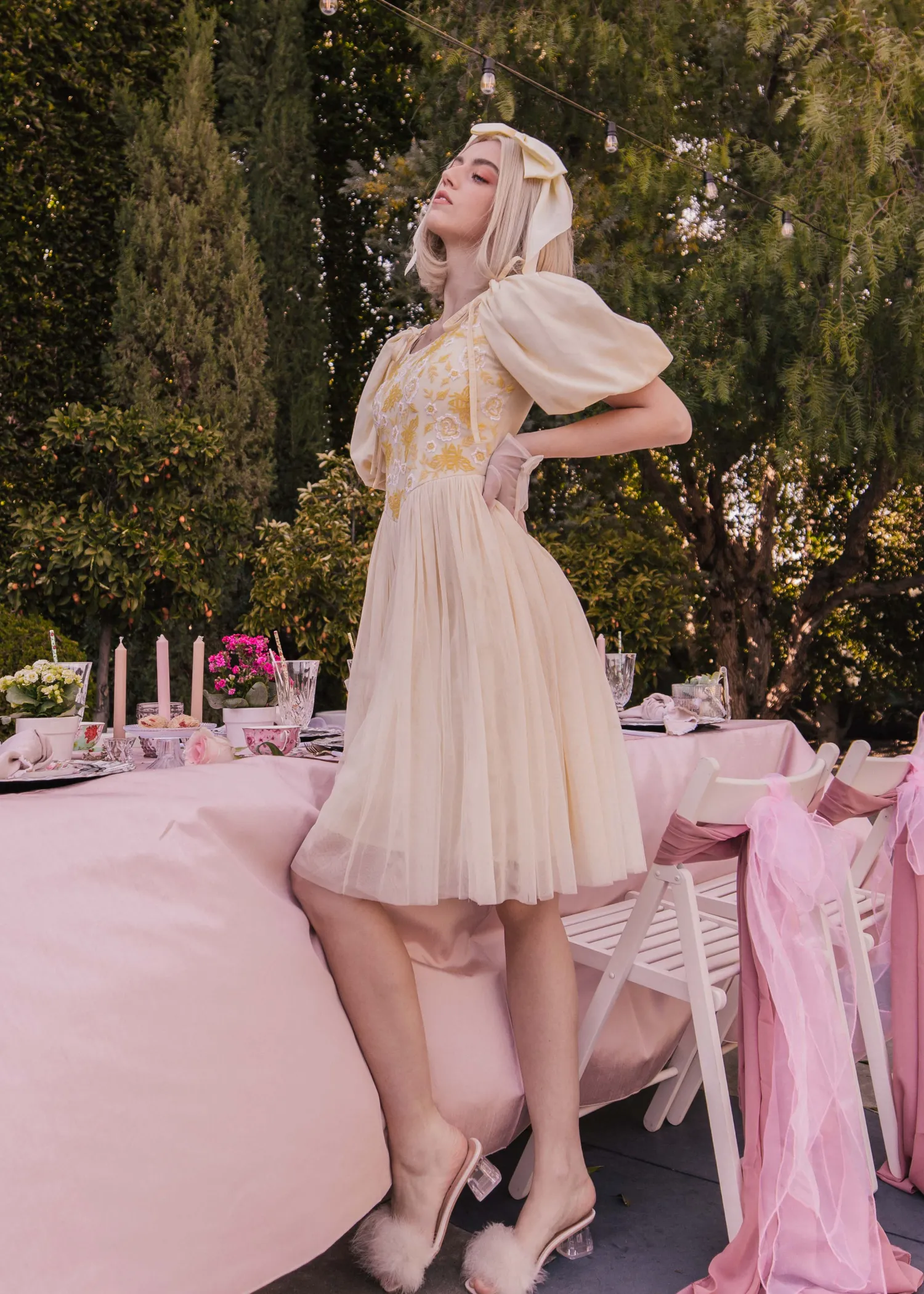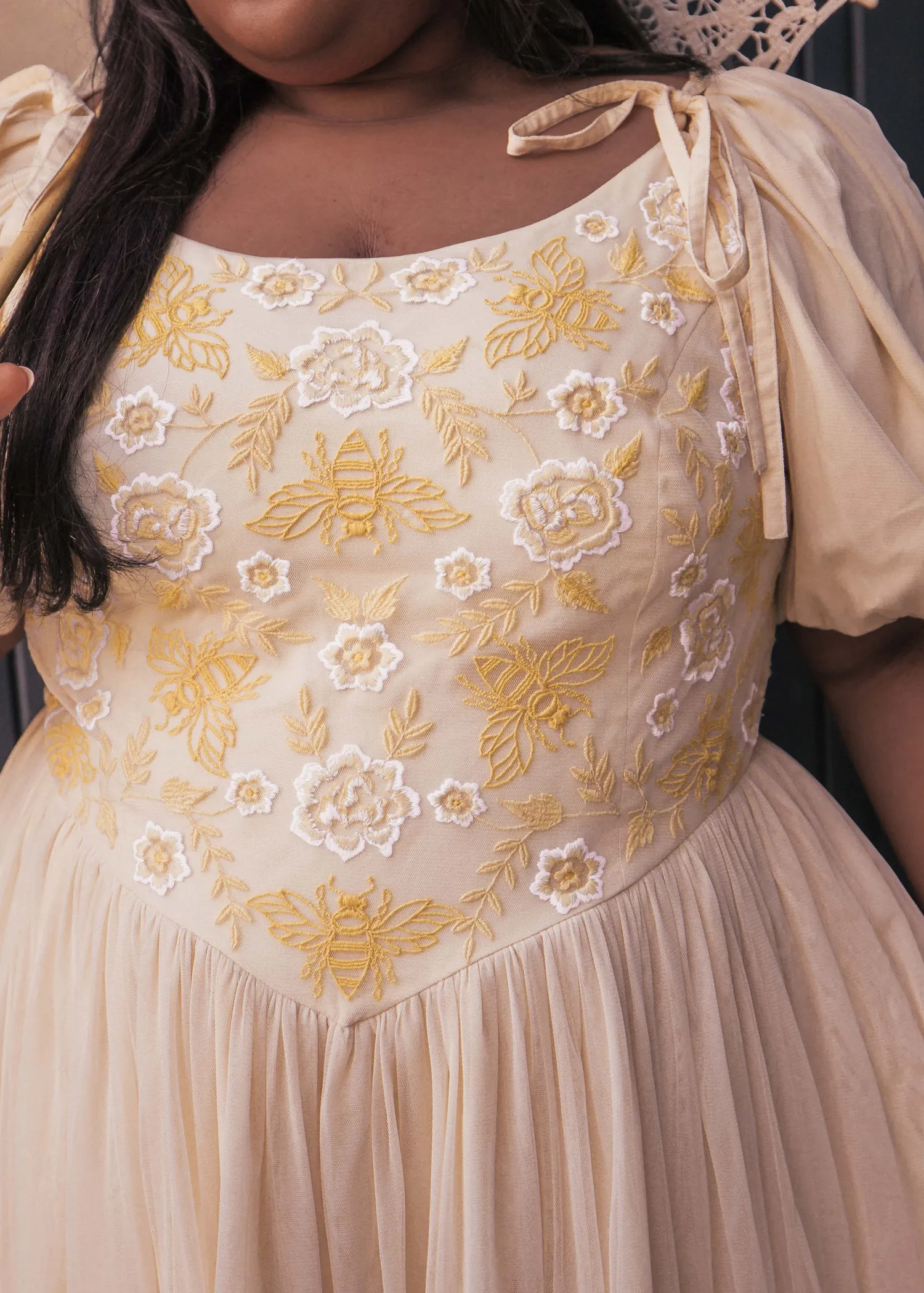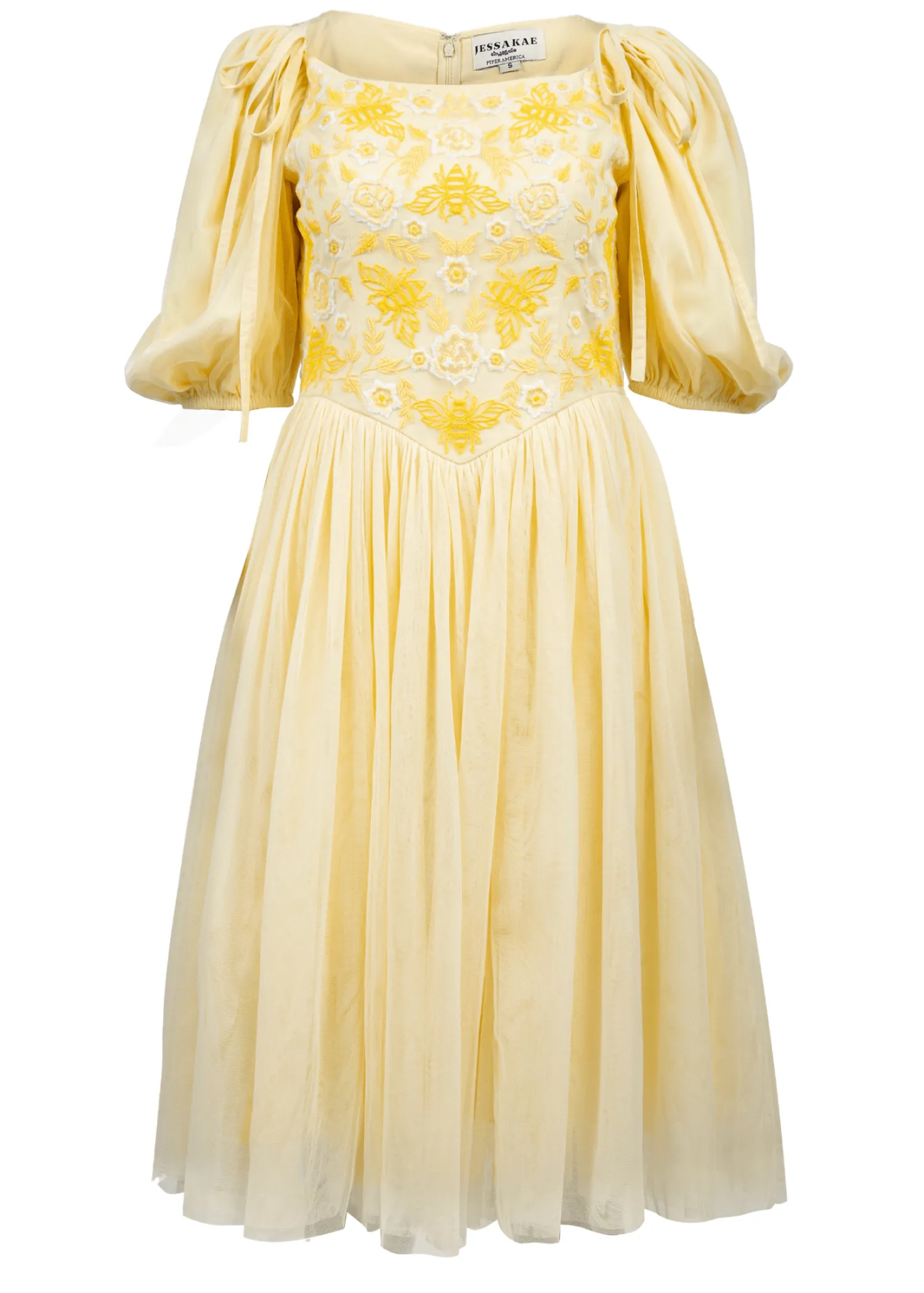 Add this new sweet and stylish dress to your wardrobe. The Honey Bee Dress features beautiful golden-yellow fabric, bee floral embroidery, a princess waistline, and lantern puff sleeves. This dress will have you buzzing with delight!
