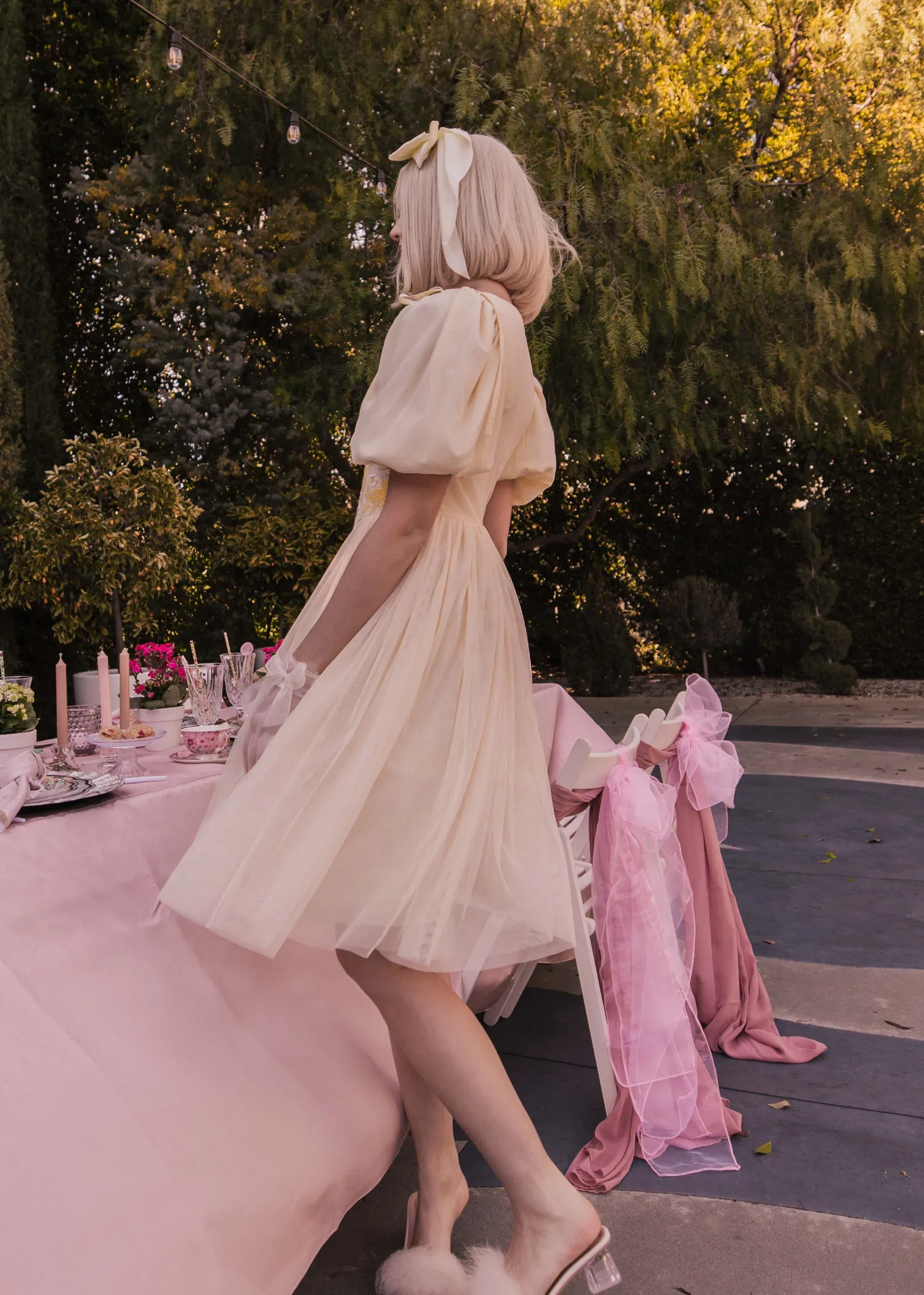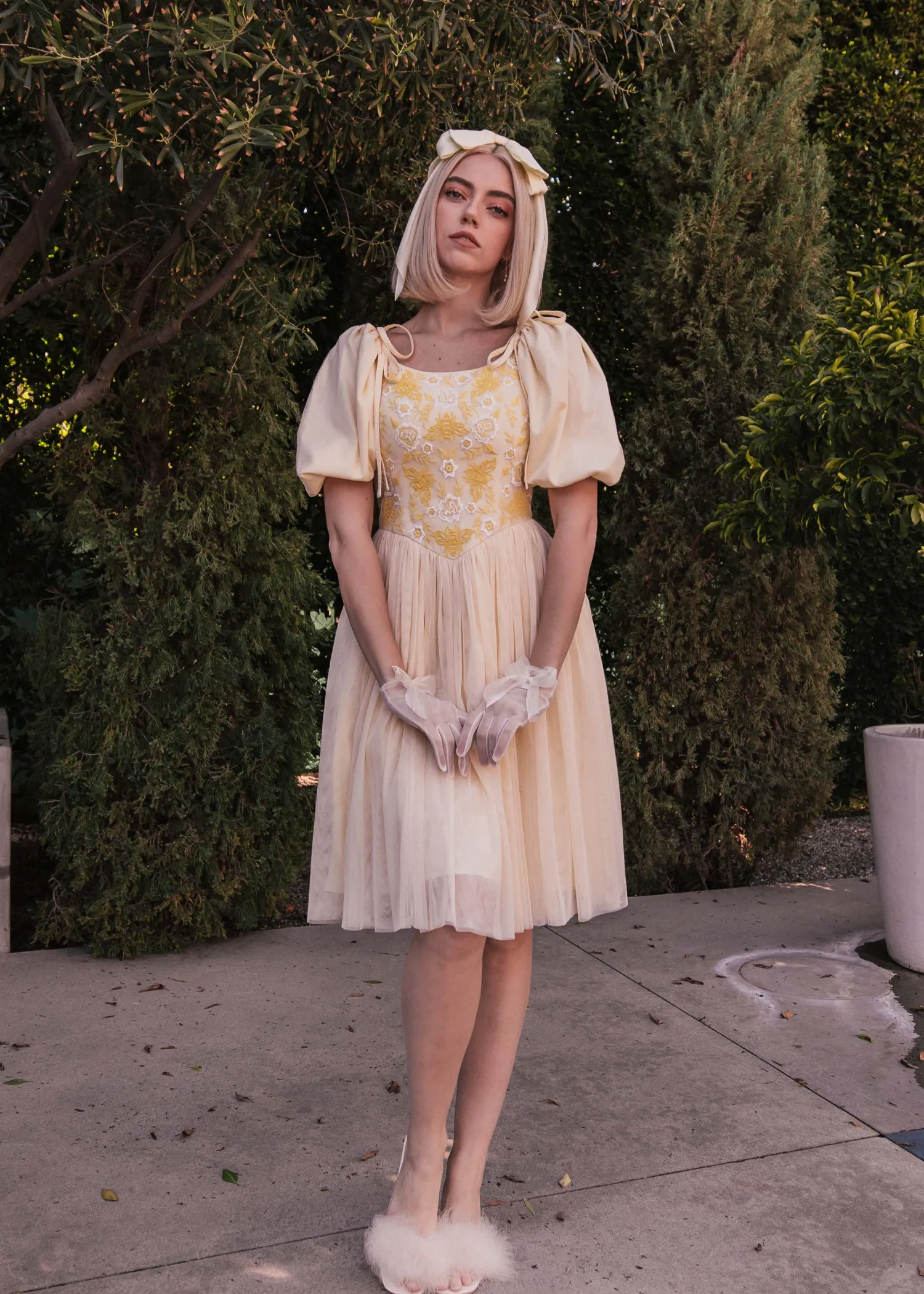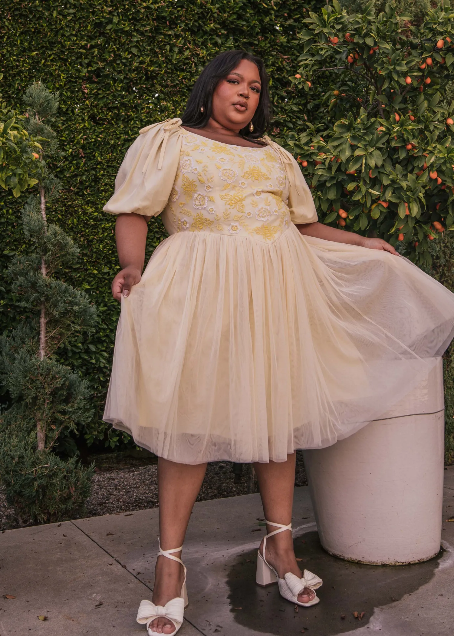 Add this new sweet and stylish dress to your wardrobe. The Honey Bee Dress features beautiful golden-yellow fabric, bee floral embroidery, a princess waistline, and lantern puff sleeves. This dress will have you buzzing with delight!