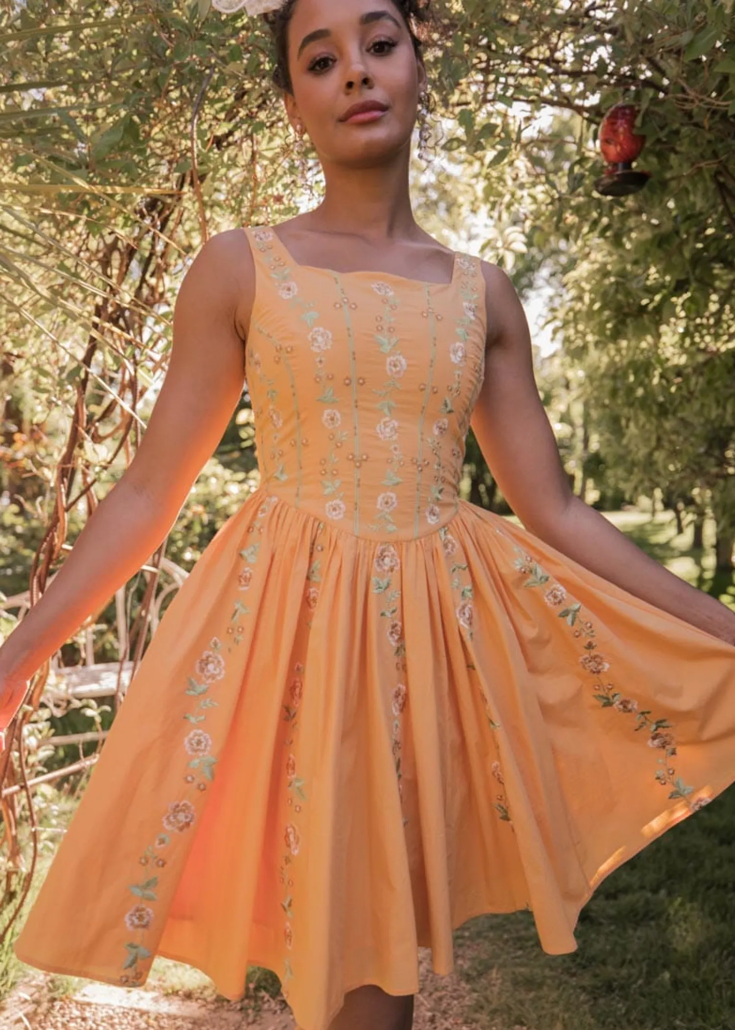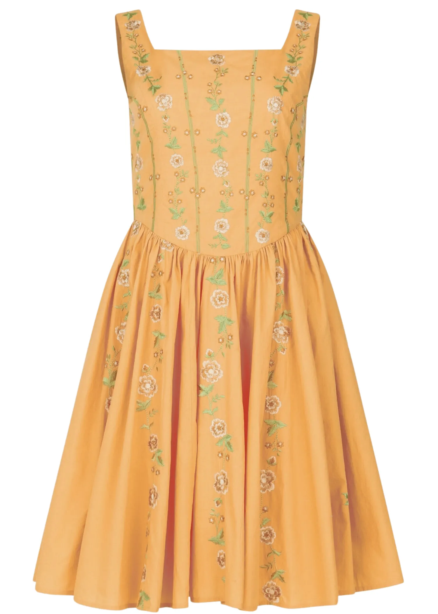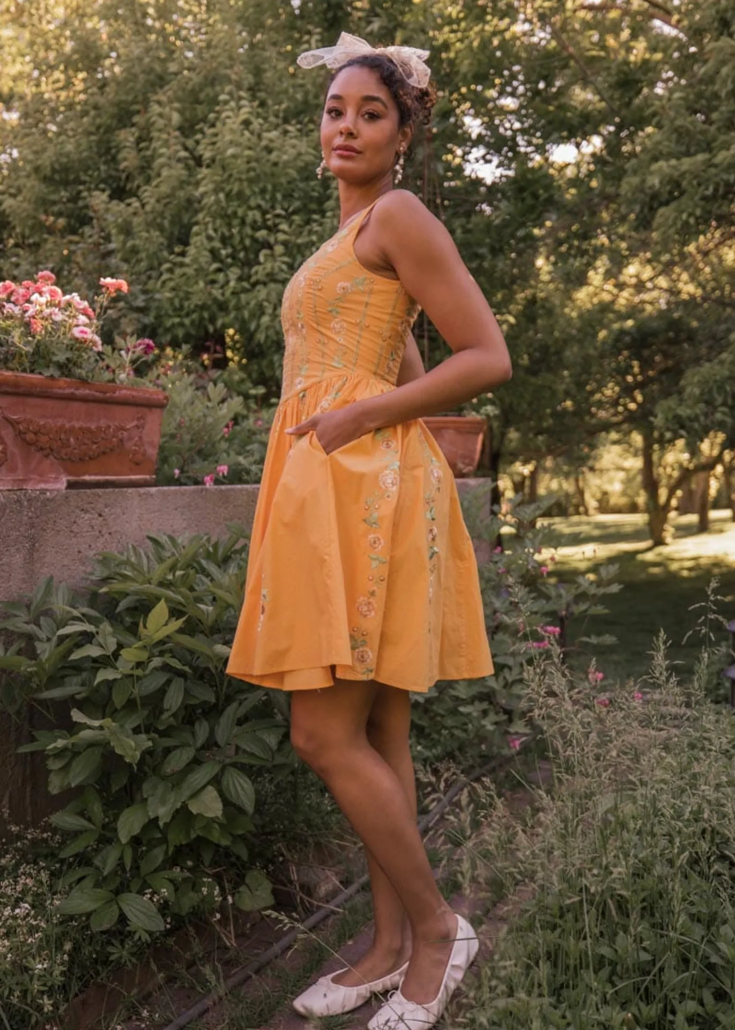 This mini dress exudes the charm of summer romance in its sunny yellow vibrance. Delicate floral embroidery adds a touch of elegance to its playful silhouette. The sleeveless design and fitted bodice create a flattering shape, while the flowing skirt offers a whimsical and comfortable fit. Perfect for warm-weather outings, this dress effortlessly combines style and grace.
