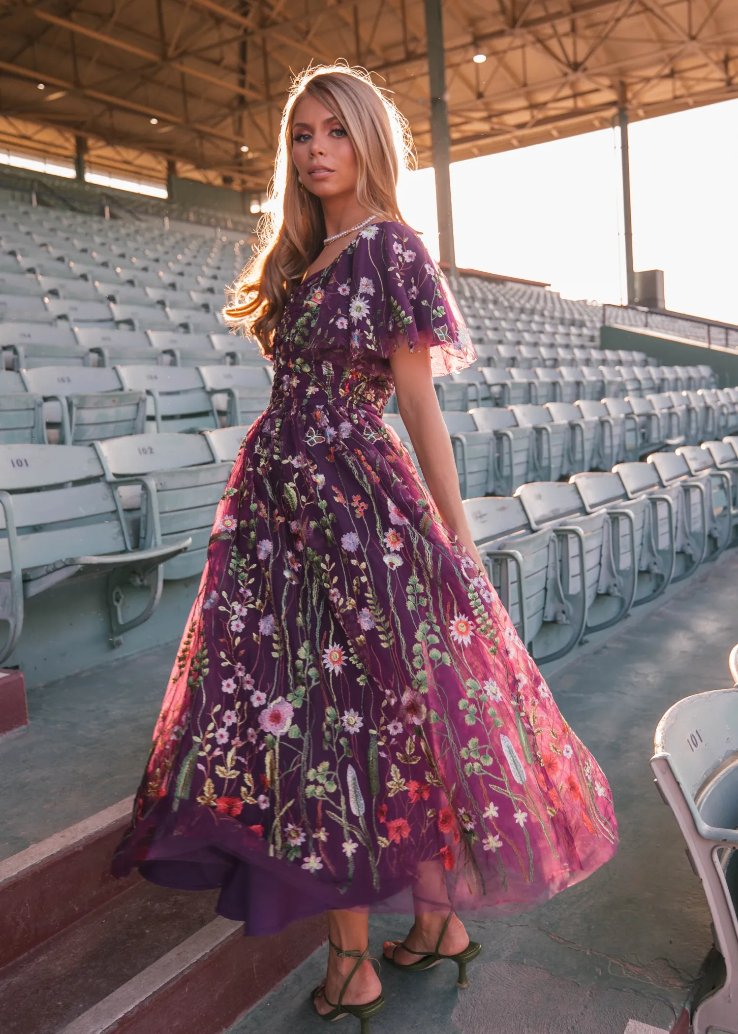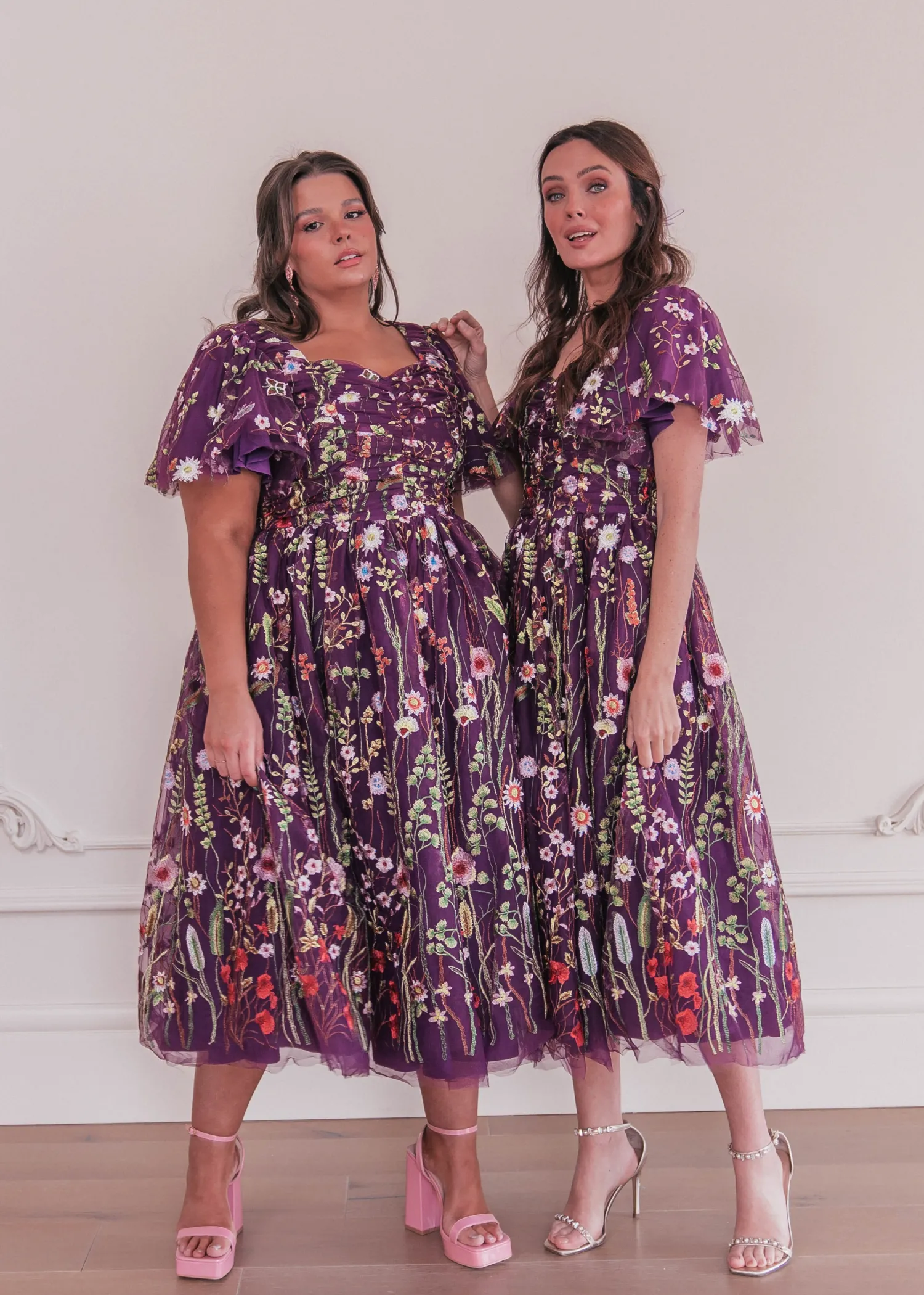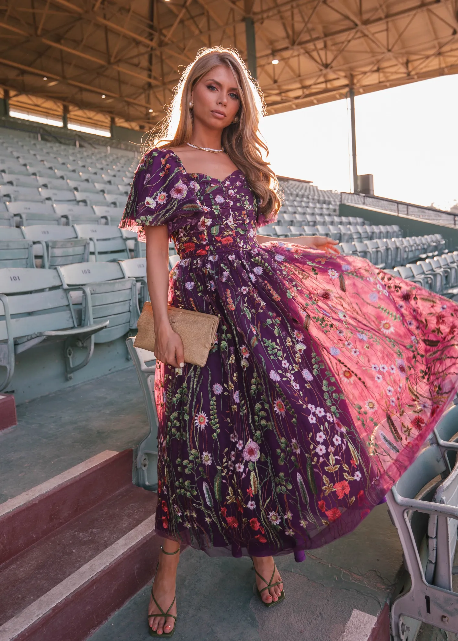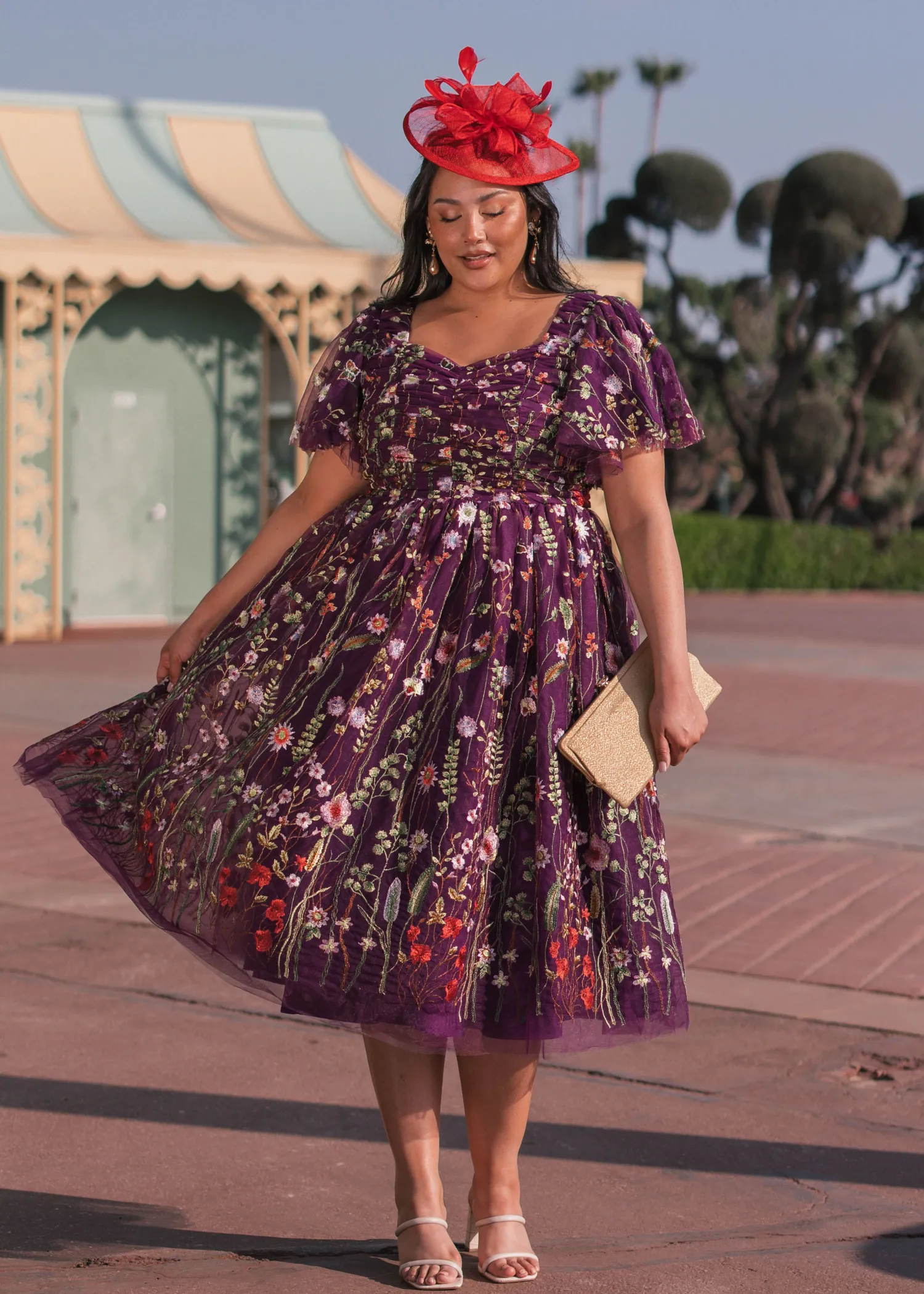 Grace the racetrack in a rich magenta gown embellished with opulent floral embroidery that cascades gracefully over its silhouette. Crafted with unparalleled attention to detail, each stitch tells a story of artistry and finesse. The vibrant hues of purple, reminiscent of royal regalia, exude a sense of luxury and exclusivity, making it a perfect choice for those who wish to make a bold statement. Features flutter sleeves, a ruched bodice, and a sweetheart neckline.