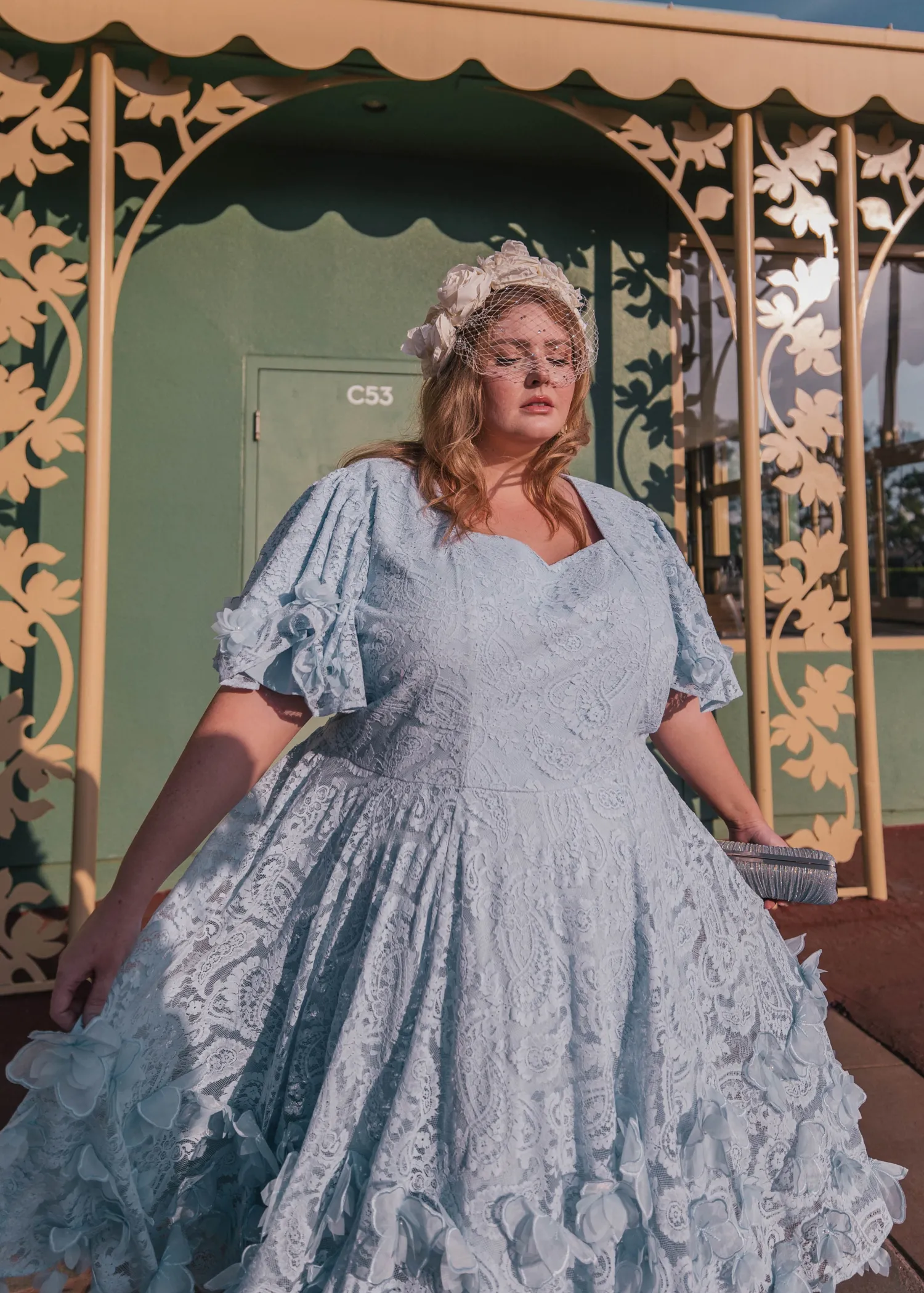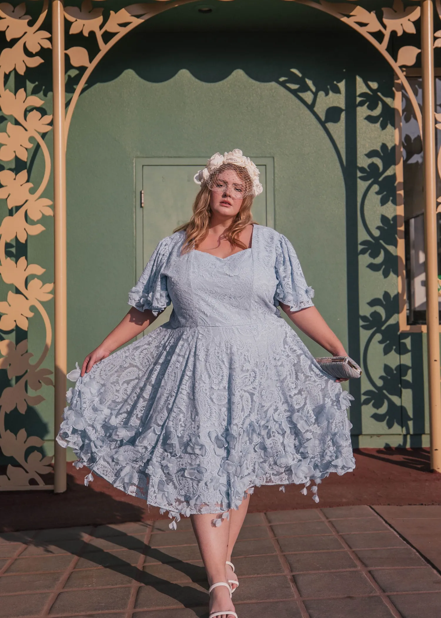 This lively lace design in blue embodies all the timeless charm of Derby Day festivities. Adorned in floral appliques cascading from the hem, this dress blends whimsy with classic grace that captivates with every step. Each applique is meticulously placed to offer magic and romantic flair that dances on the breeze. Whether to the track or a spring soiree, this rare display of artistry will be your winning ticket for an unforgettable look.