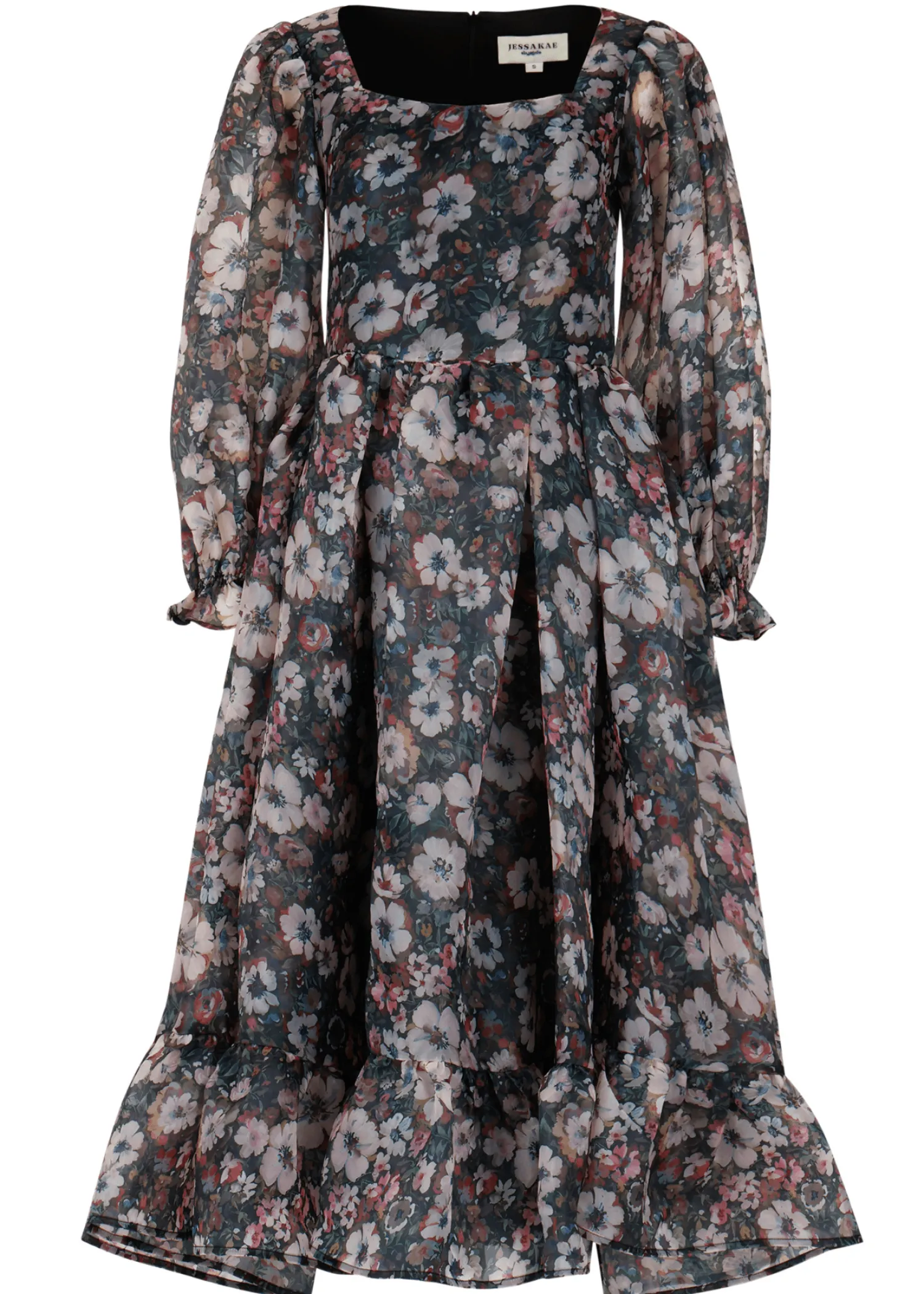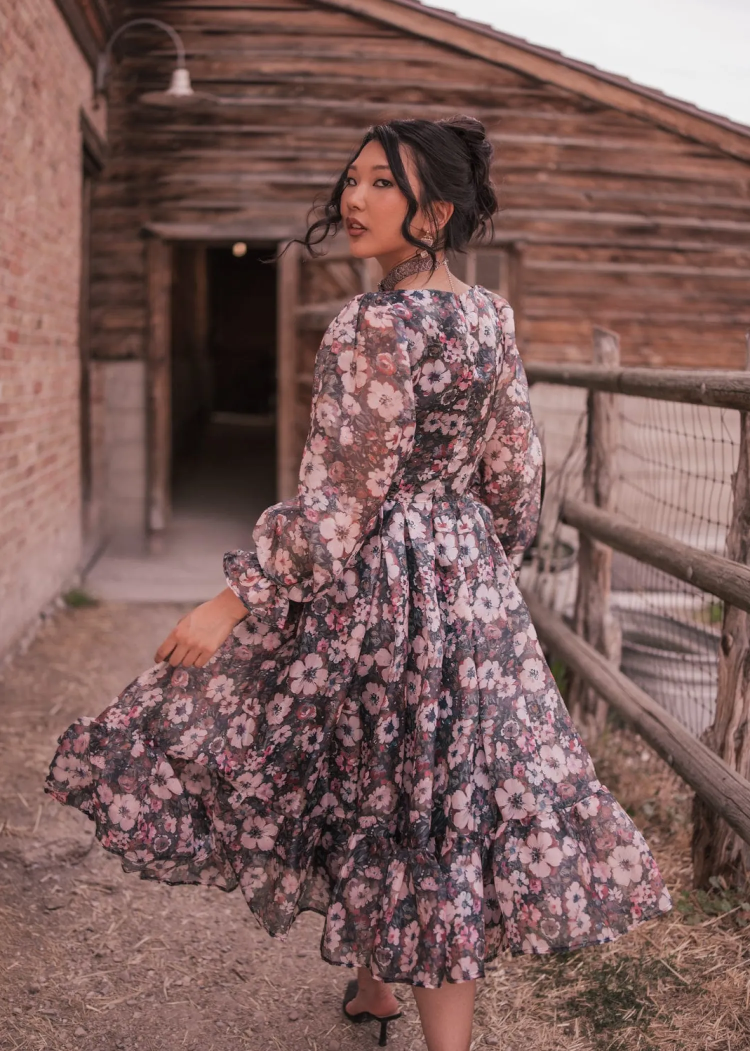 The Persephone Dress is a delicate blend of vintage charm and modern sophistication. Its soft floral print, set against a deep, muted background, evokes the essence of romance in graceful shades of gray. The flowing silhouette, complete with billowing sleeves and a ruffled hem, is perfect for any occasion where you want to feel effortlessly stylish.