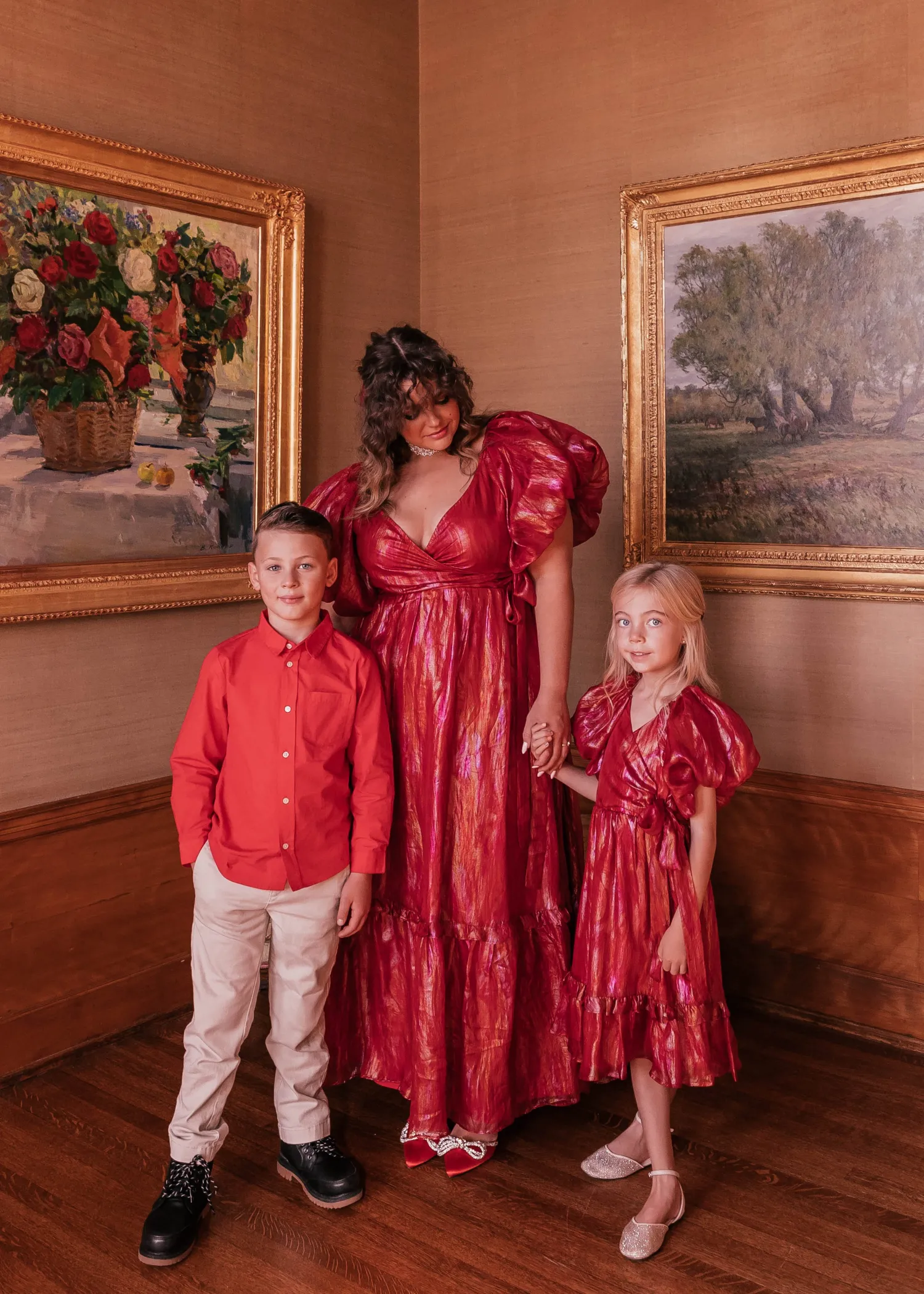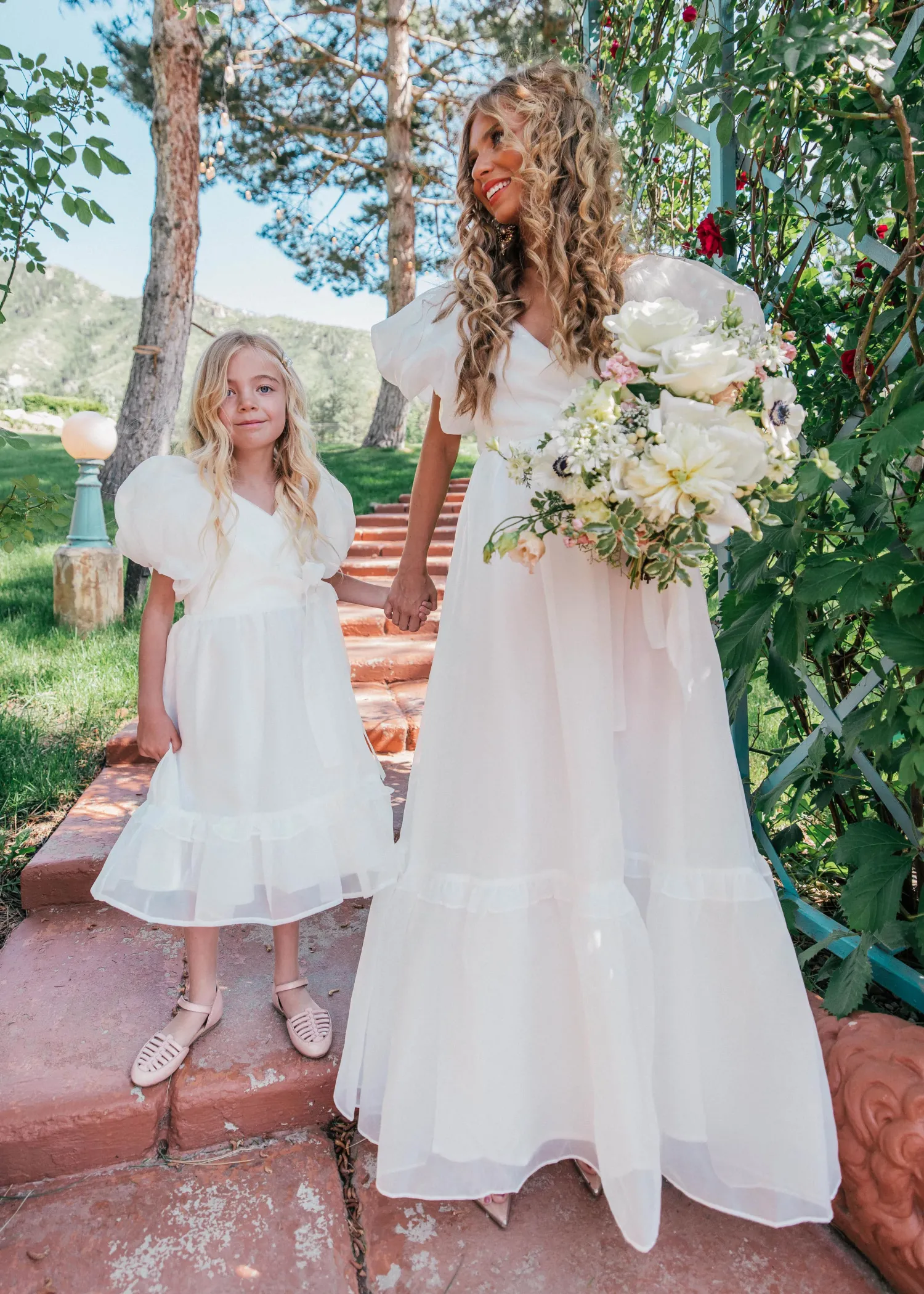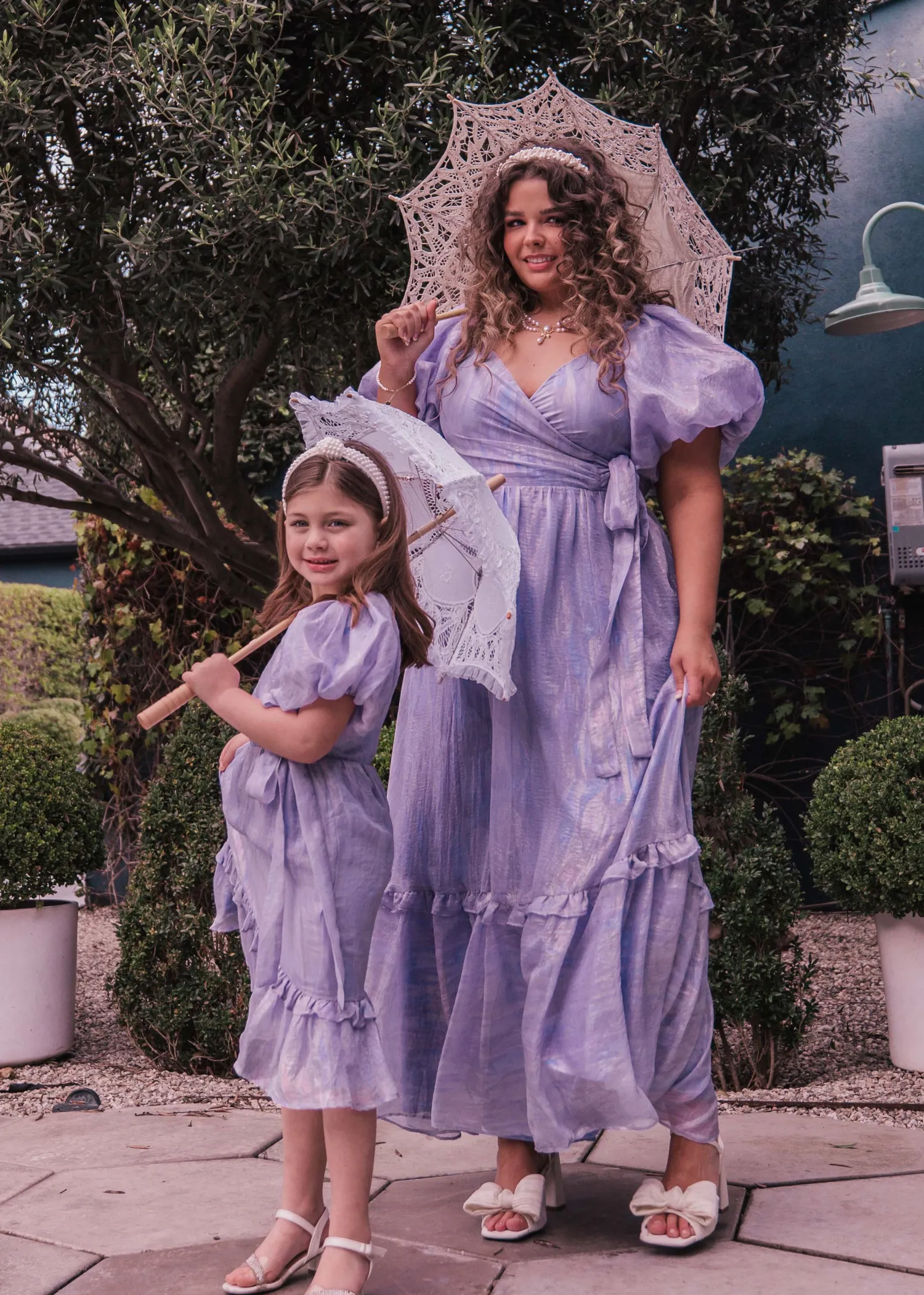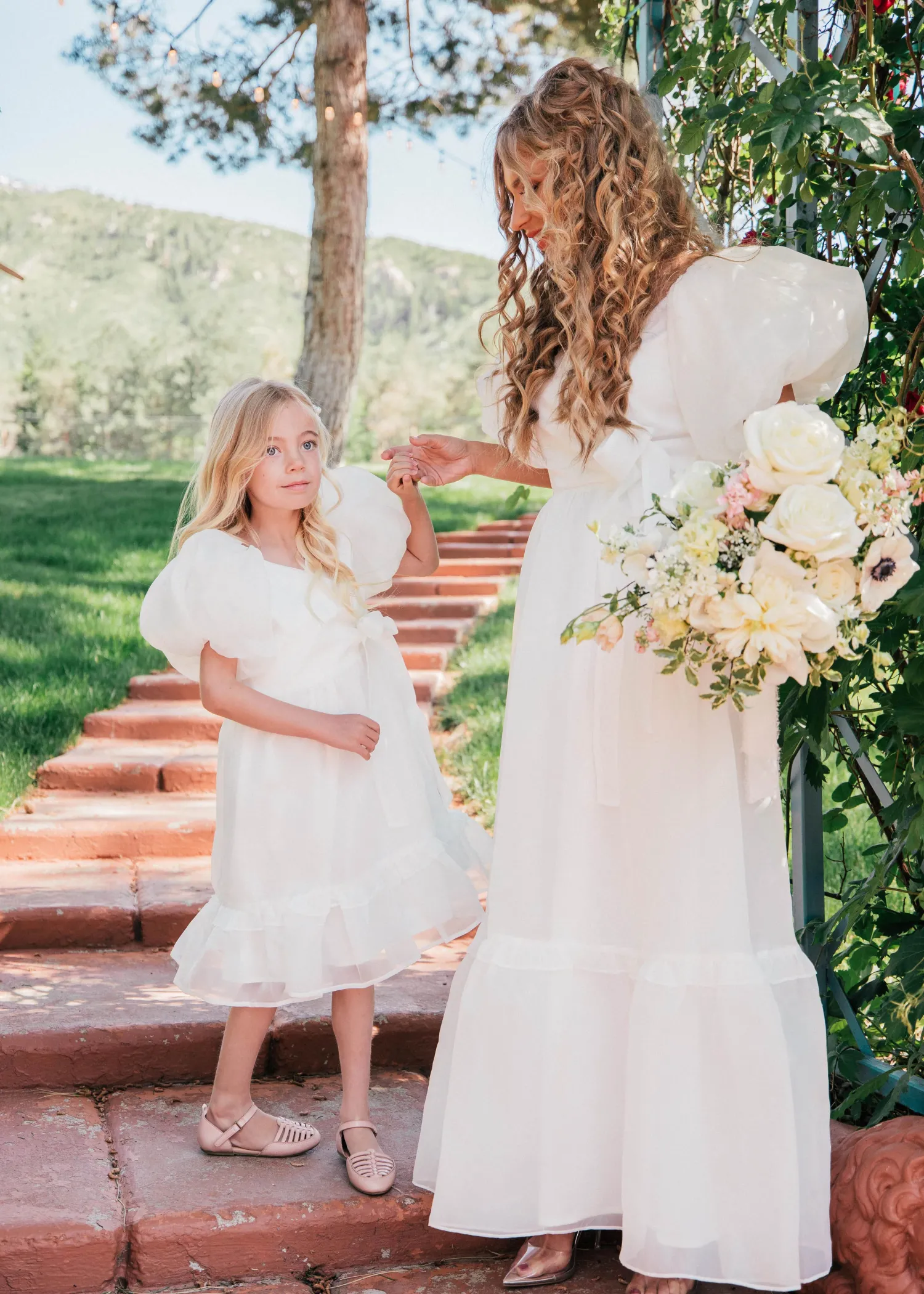 This dreamy, whimsical dress will be the perfect addition to any event. Its dreamy puff sleeve and flattering v-neckline are complemented by a twirl-worthy skirt, hidden side zipper, and fitted waistline. Fully lined. Match with your cute babies for the ultimate mommy + me look.
