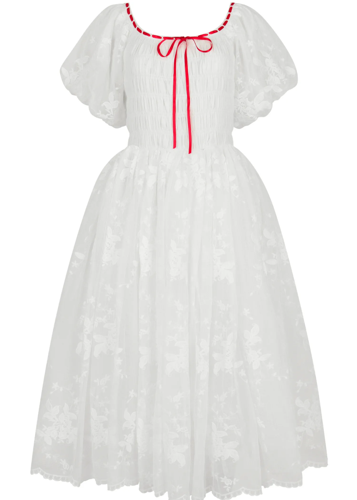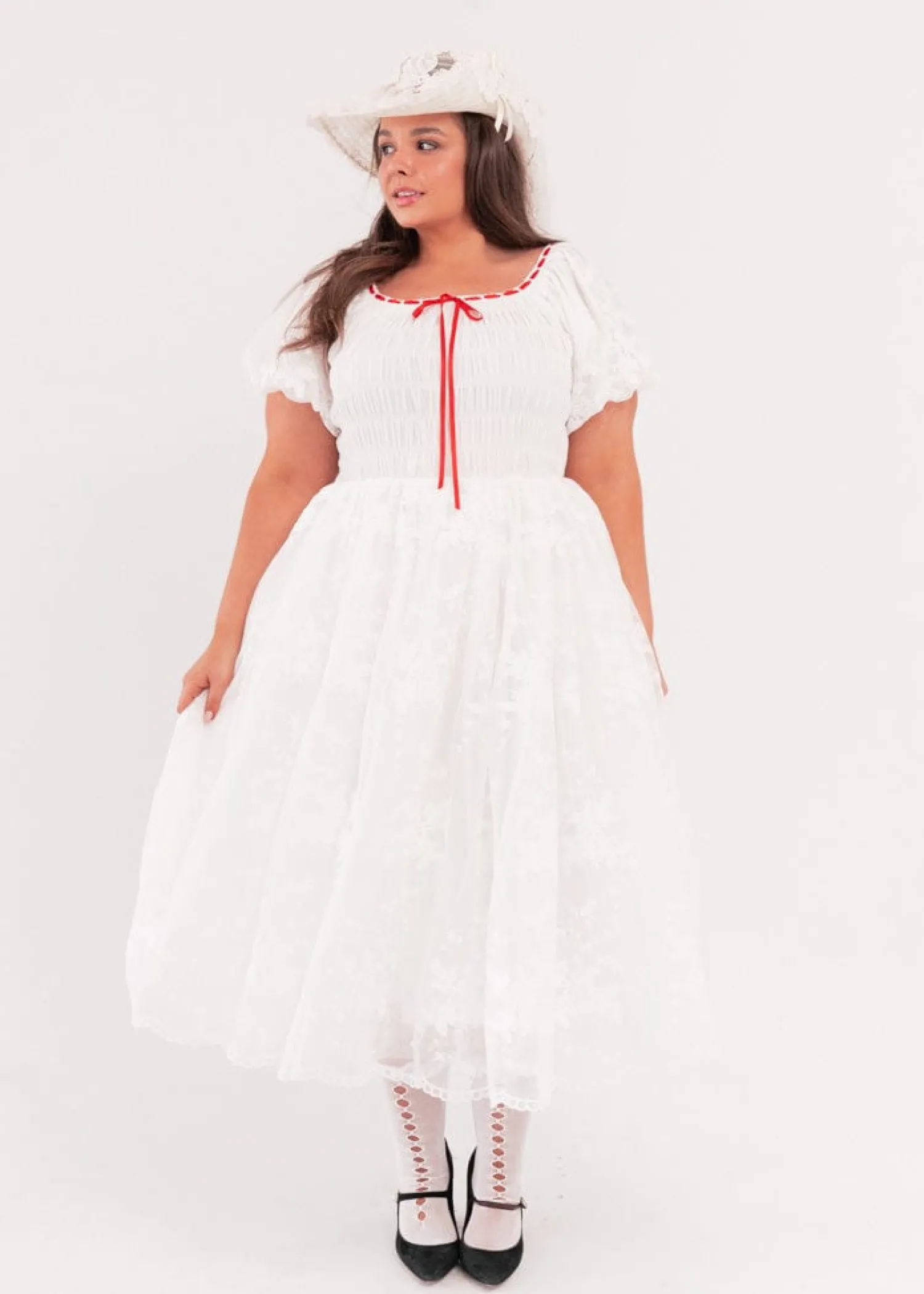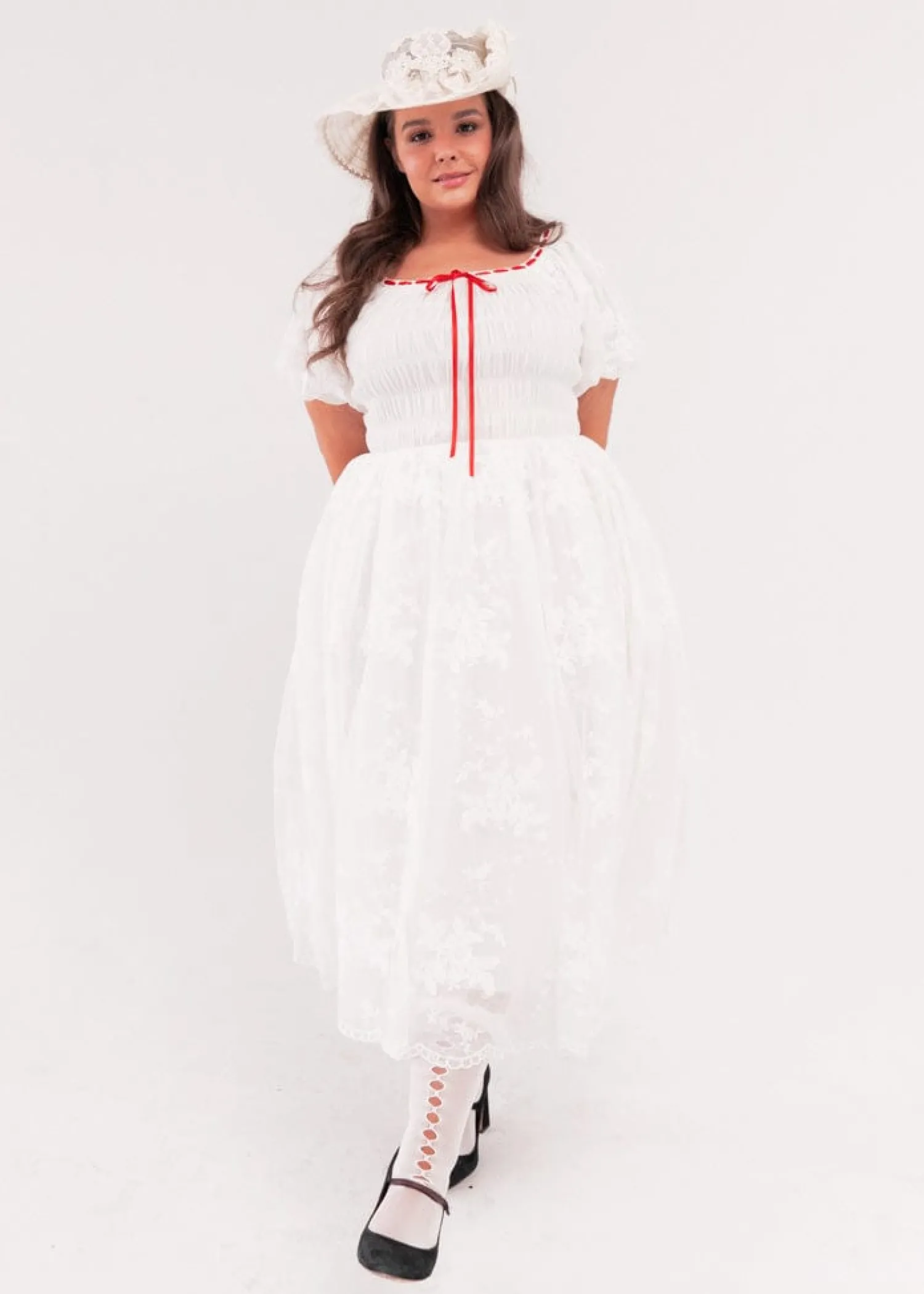 The Poppins Dress is a nod to vintage elegance and the essence of everyone's favorite magical nanny! The crisp white fabric is adorned with floral details that are beautifully contrasted by a bold red trim and delicate bow – adding a pop of color to this classic silhouette. With its flattering off-the-shoulder fit and playful puff sleeves, this dress exudes sophistication. Whether dressing up for Halloween or out for a magical adventure, this ensemble can only be described as practically perfect in every way!