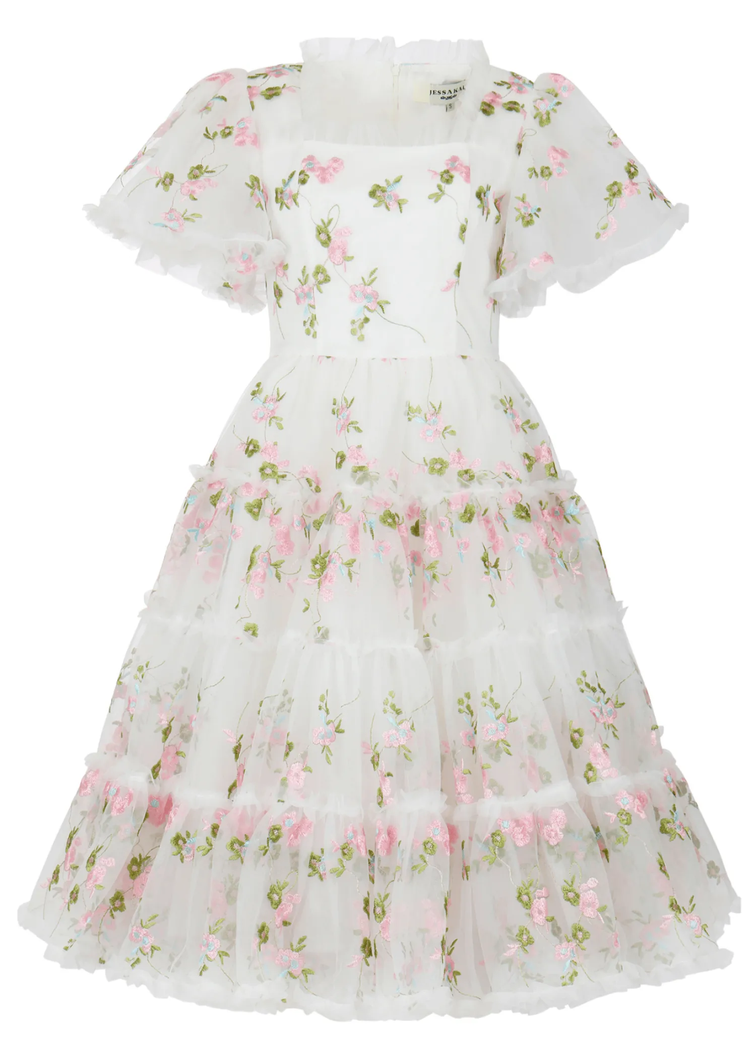 - Ruffled square neckline
