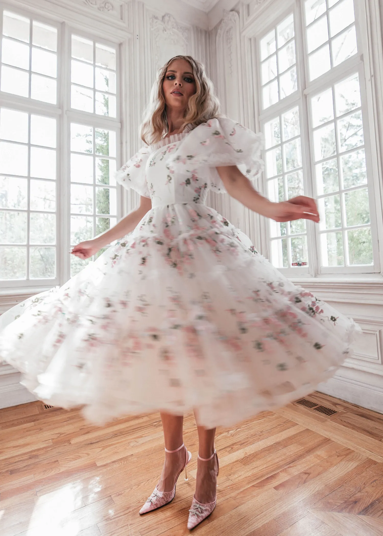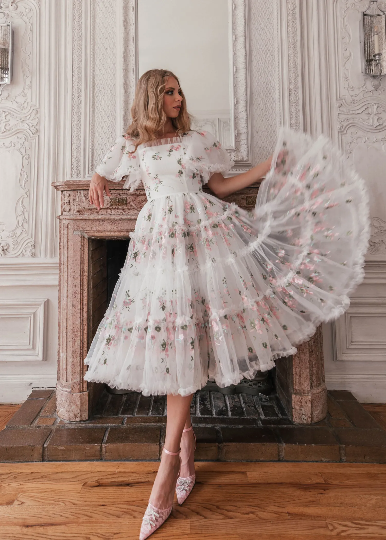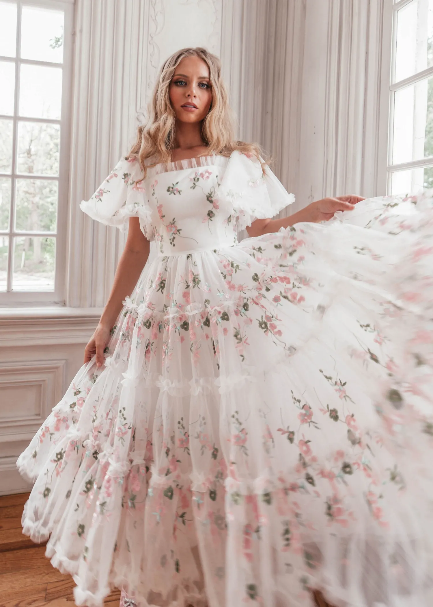 Fit for any bridal event, this twirly, flowy, flowery gown was made for lively joy. Floral appliqués in pink add playful femininity, and ruffles line the neckline and the hem for extra flair. This dress is best for a bride prepared to dance! A captivating choice for both a touch of whimsy and romance, she promises to dazzle!