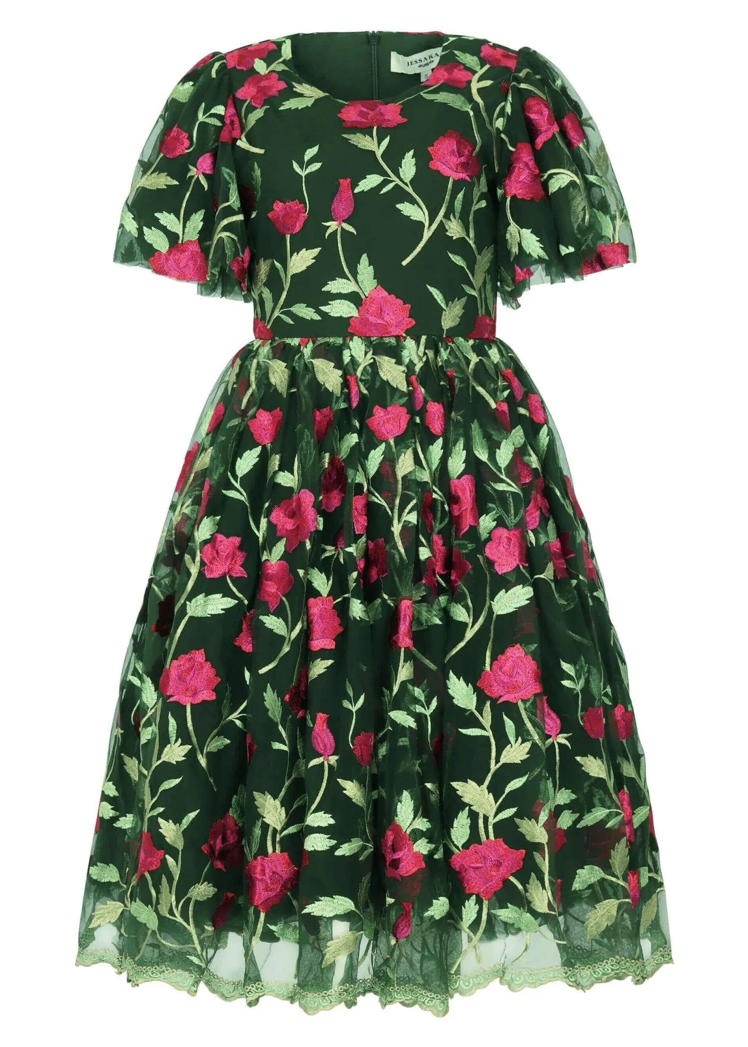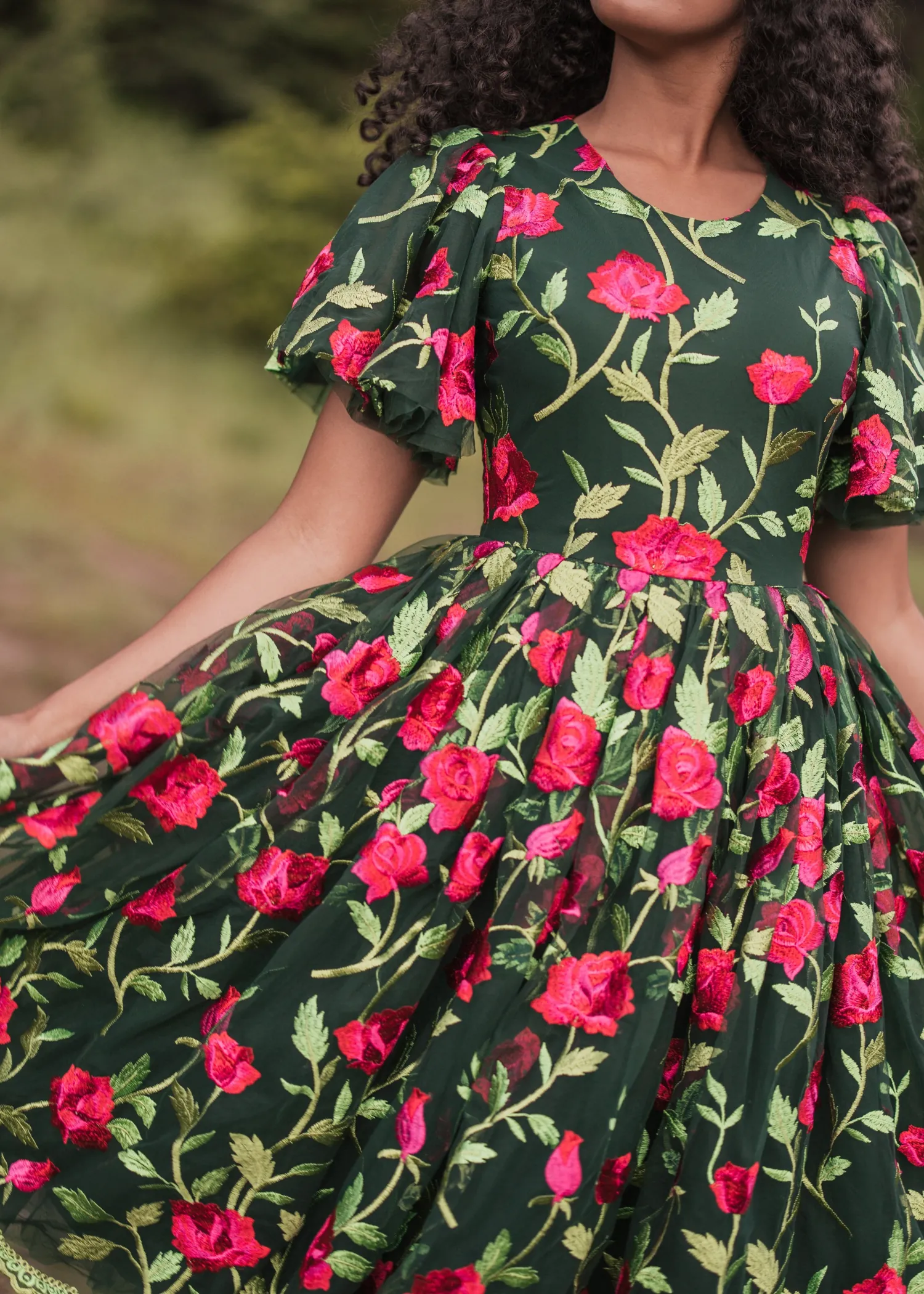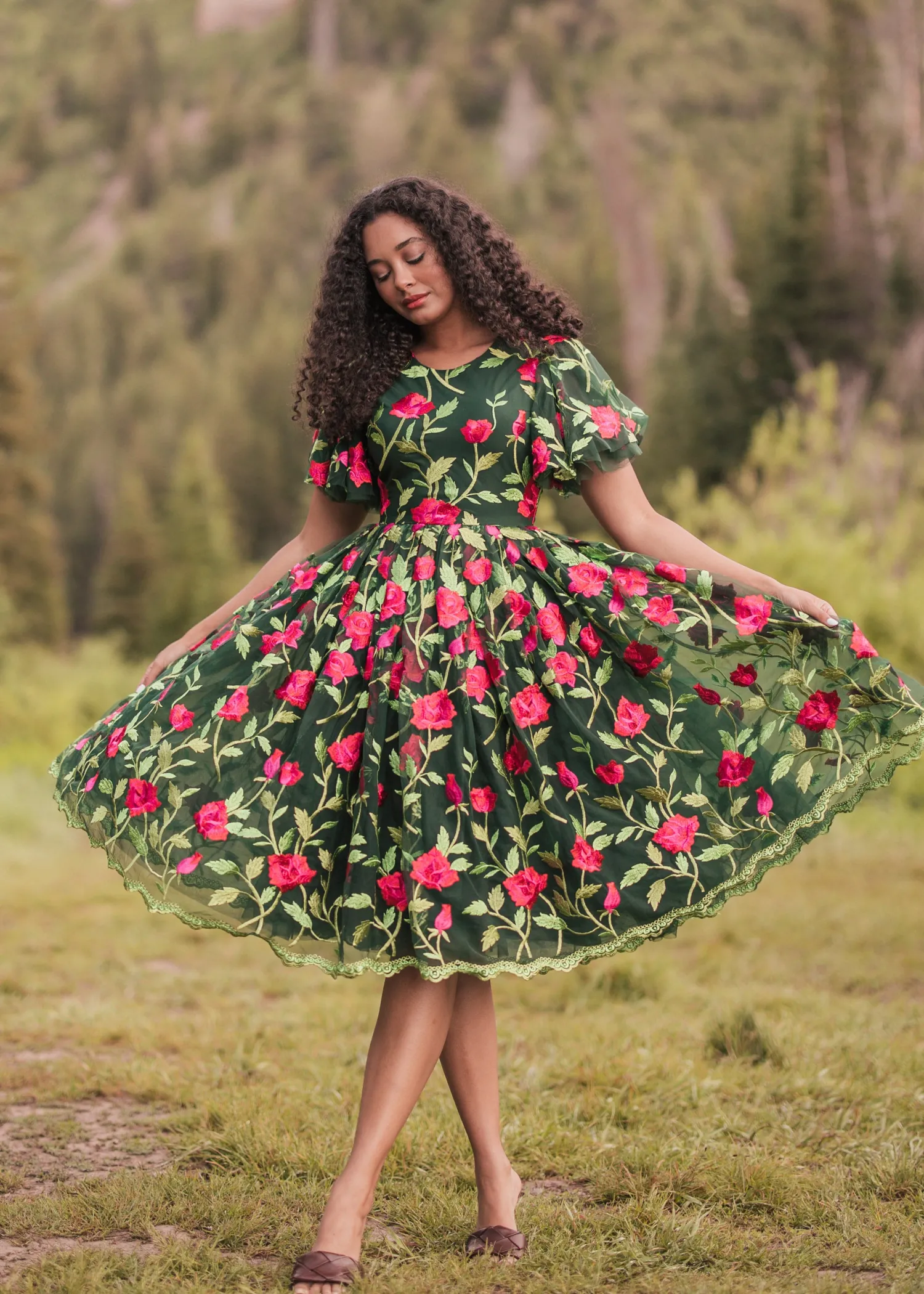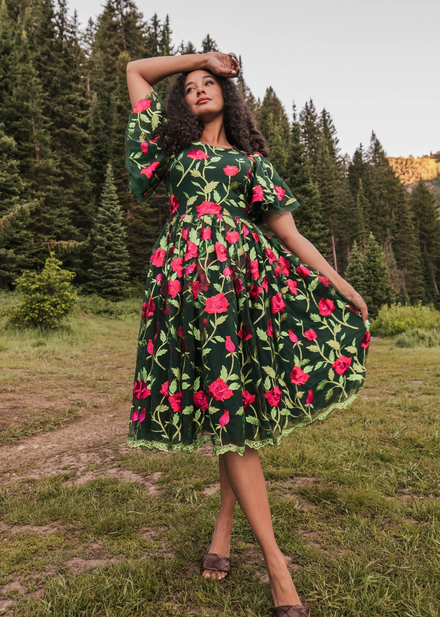 This striking dress, adorned with vibrant roses against a rich green backdrop, captures the majestic beauty of a woodland garden in full bloom. The fitted bodice with a classic round neckline flows into a twirl-worthy A-line skirt for a romantic silhouette. The sheer, flutter sleeves add a touch of whimsy and elegance, making this the perfect dress for a stylish occasion.