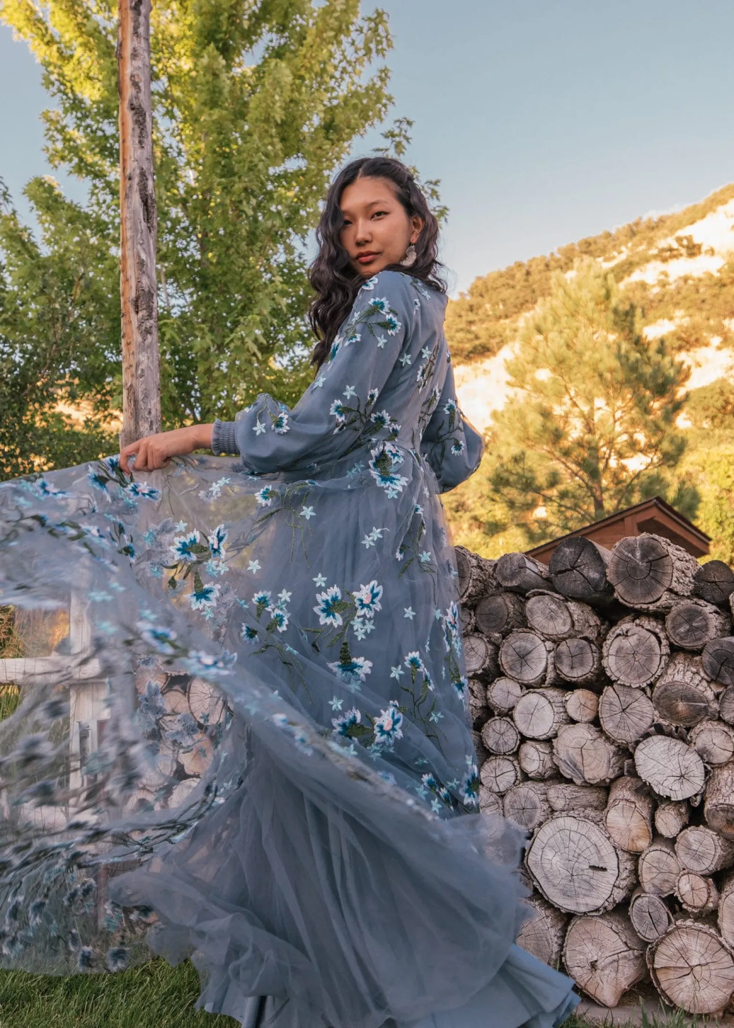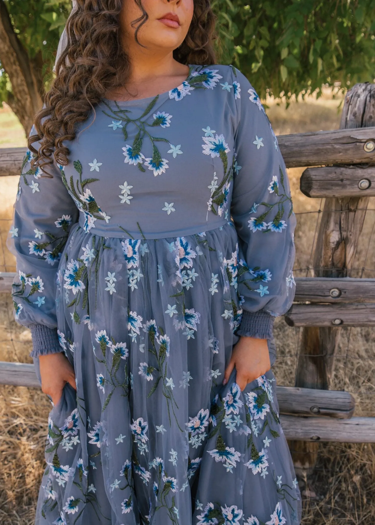 The Rowan Dress is a breathtaking blend of sophistication and natural beauty. Featuring a serene, dusky blue hue adorned with intricate white and green floral embroidery, this dress evokes the tranquility of a woodland meadow. The flowing silhouette and long, puffed sleeves offer modesty and elegance that is perfect for both formal occasions and enchanting everyday wear!