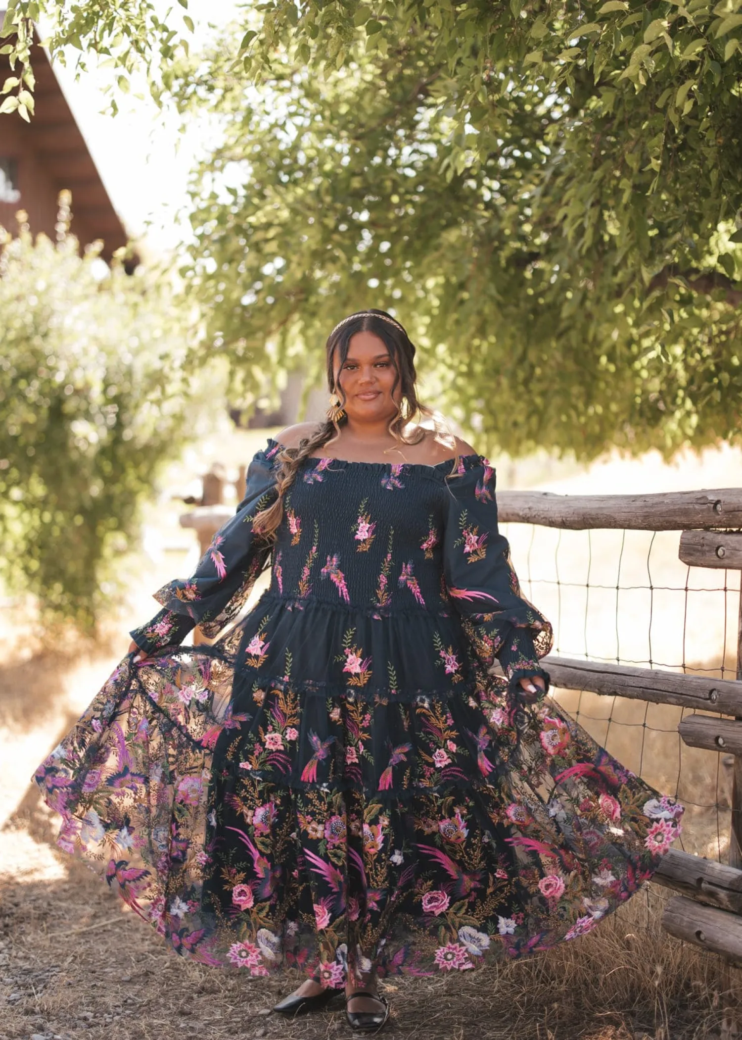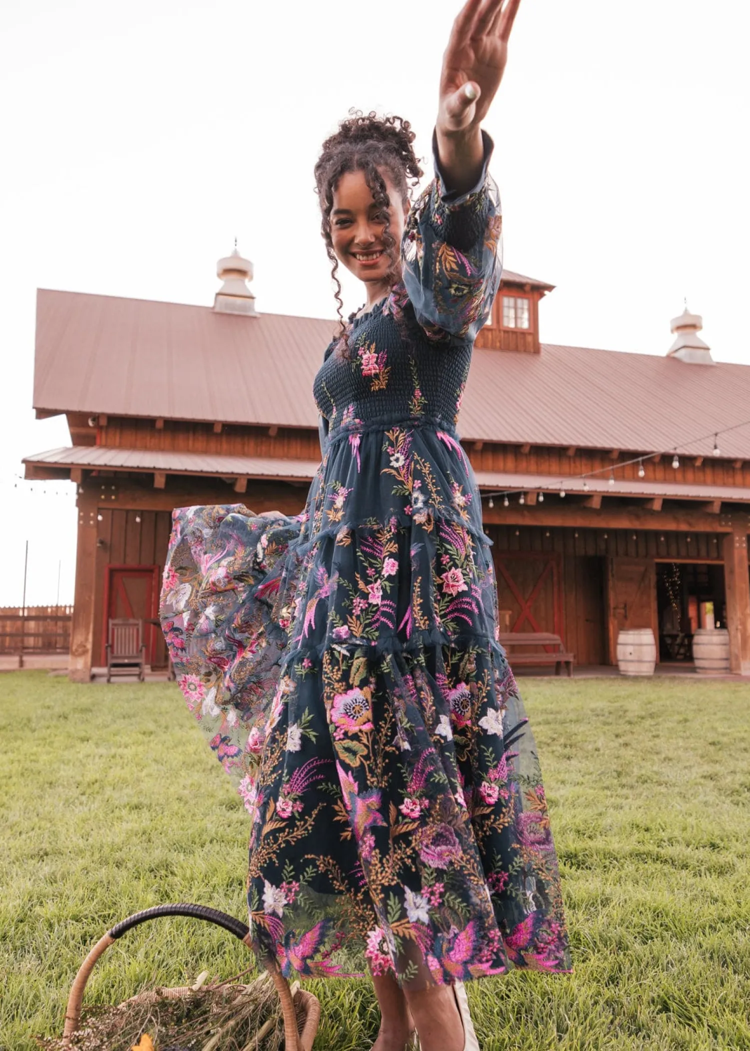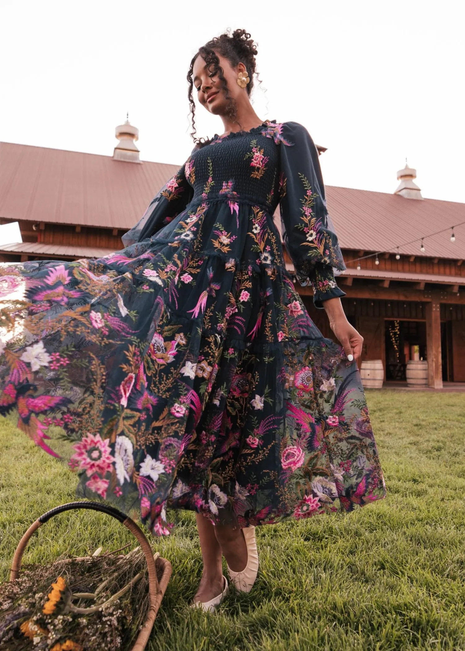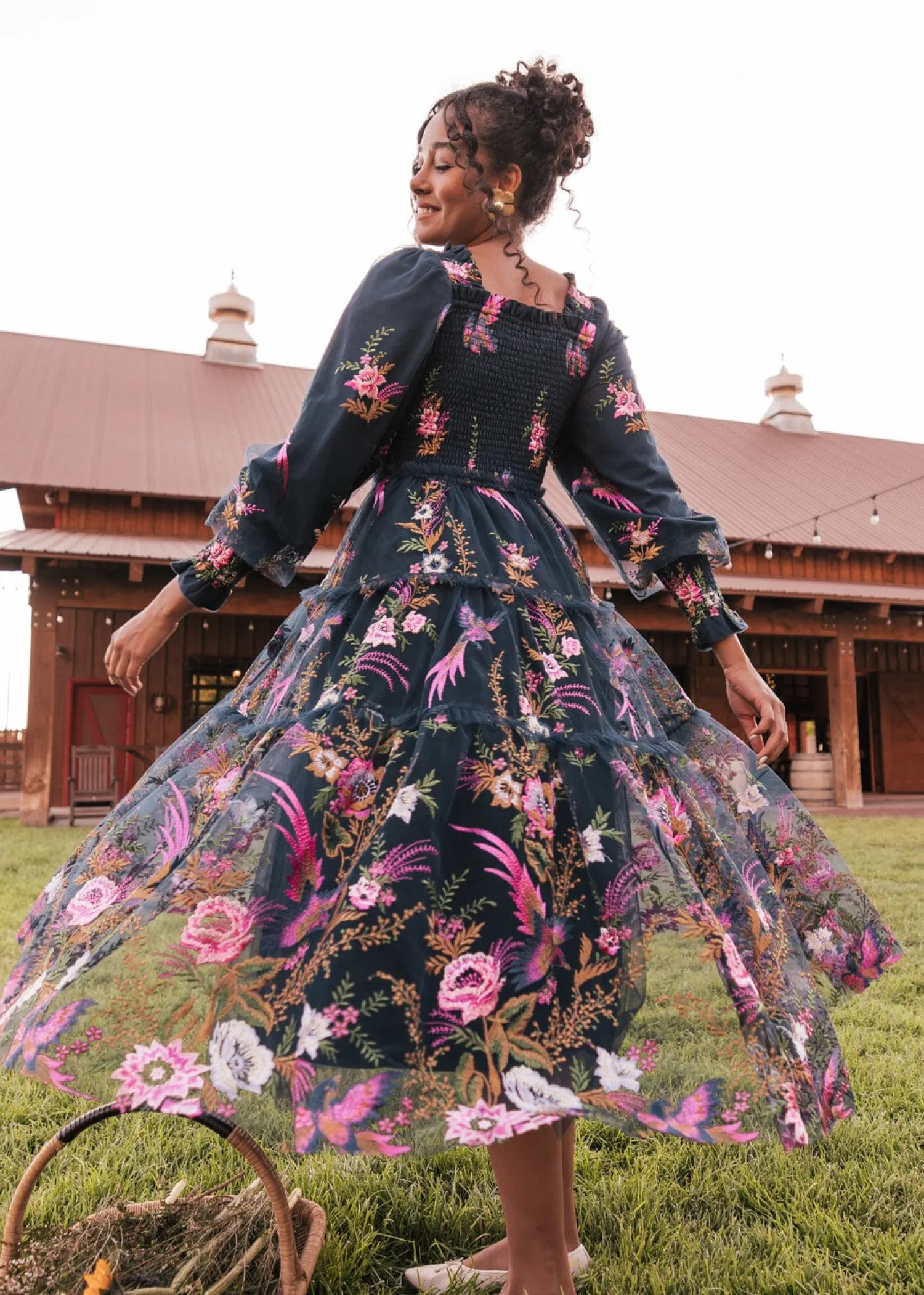 The Songbird Dress is a vibrant celebration of color and nature's beauty, featuring a deep navy base adorned with brilliant floral embroidery. The smocked bodice offers a flattering fit complemented by the voluminous, sheer puffed sleeves. The layered skirt showcases intricate patterns of pink, yellow, and green flowers that evoke the lively charm of a blooming garden. Perfect for both day and evening wear, the Songbird Dress effortlessly blends elegance and playful charm, making it a standout piece in any wardrobe.