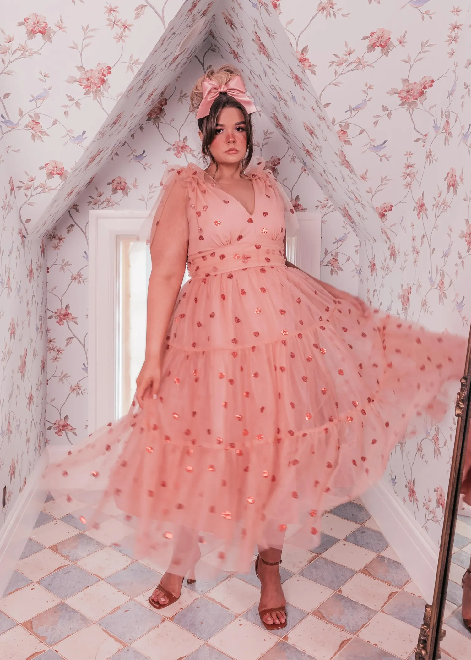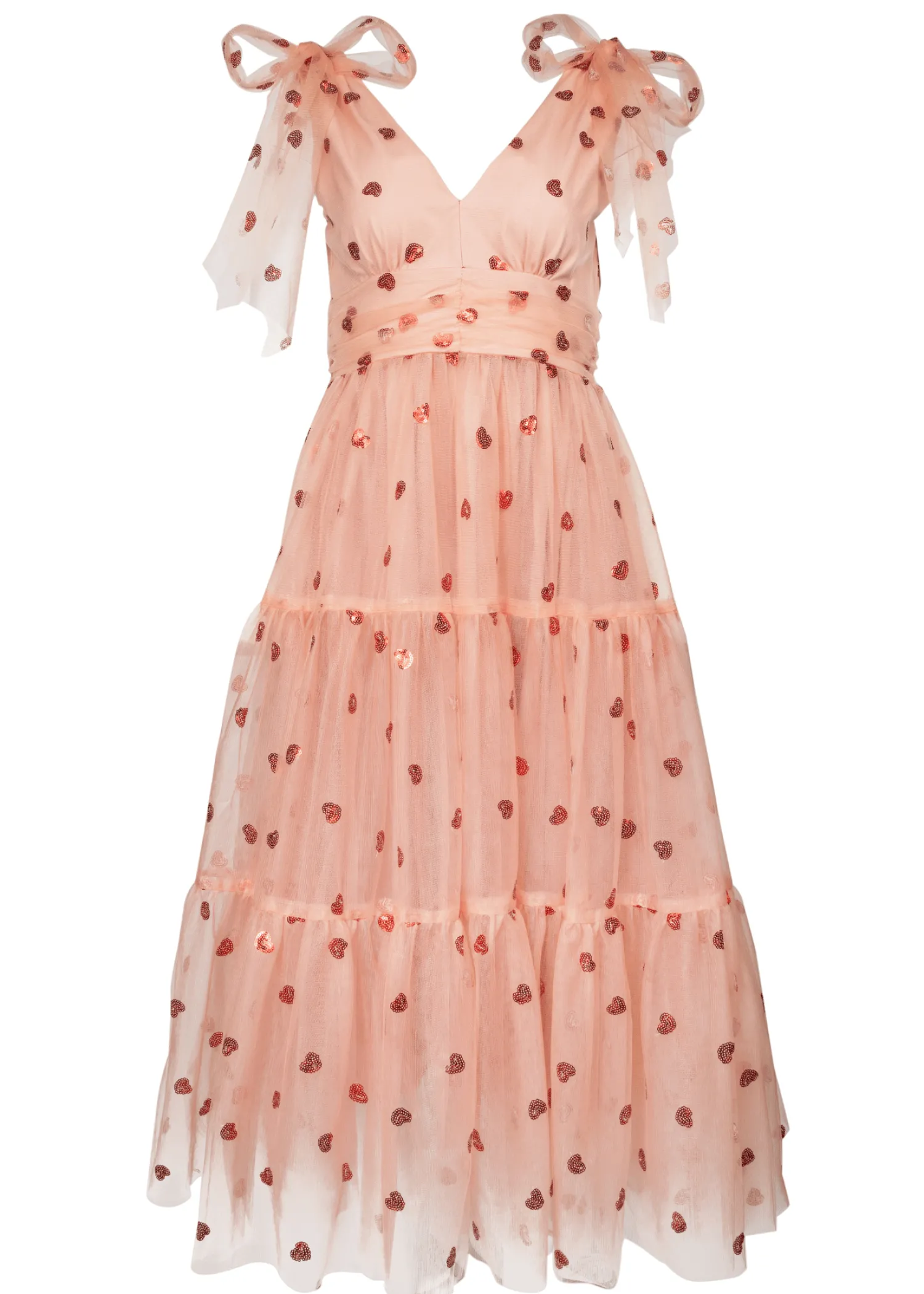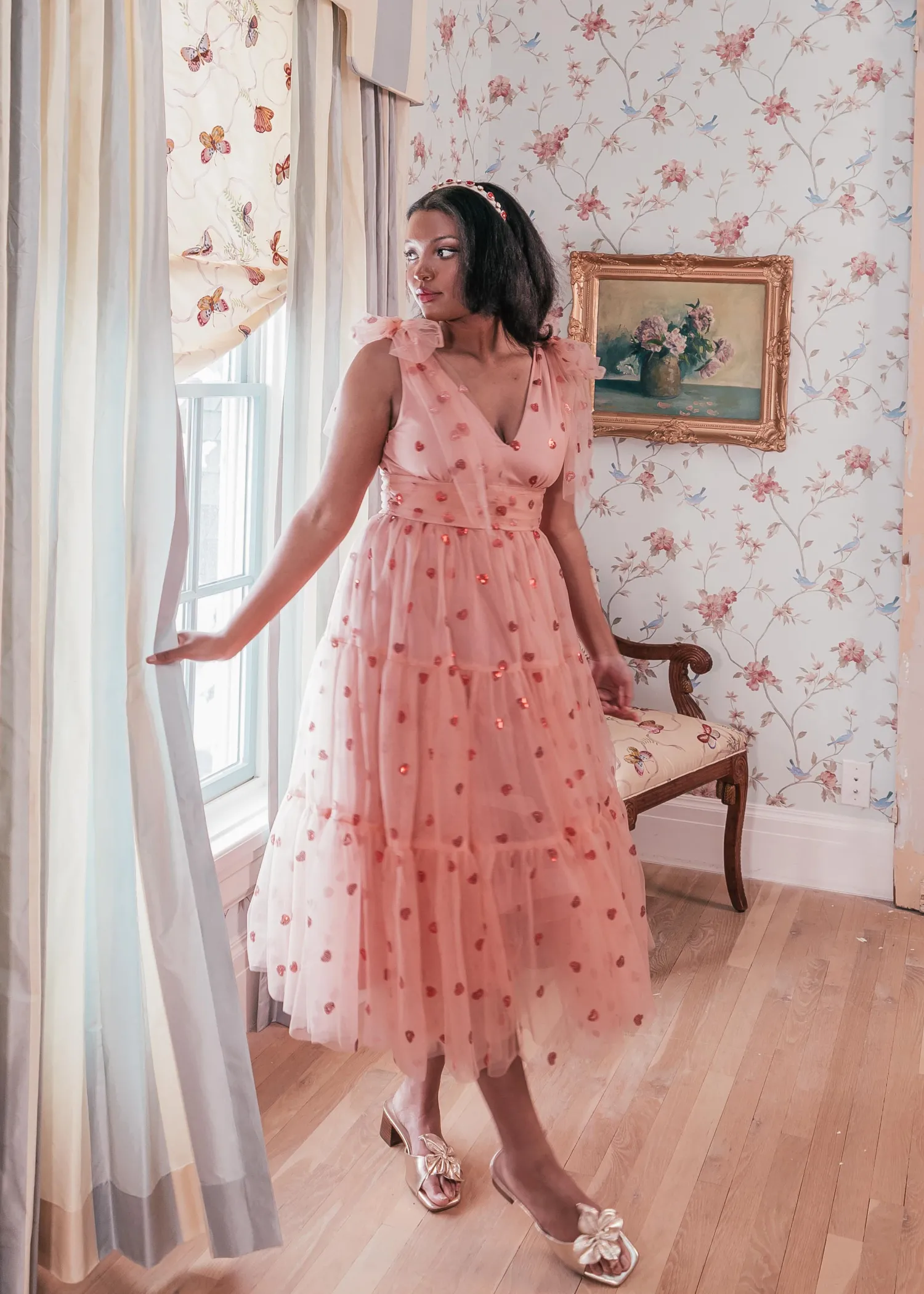 There are dresses, and then there are dresses like this. The Sweetheart Dress is a timeless piece that can take you from day to night in an instant. Featuring a swiss dot print, a flattering V-neckline, ties on the sleeves, and the sweetest sequin heart detail, this is a dress designed for the girl who loves to stand out. A slight open back completes the look with feminine charm.